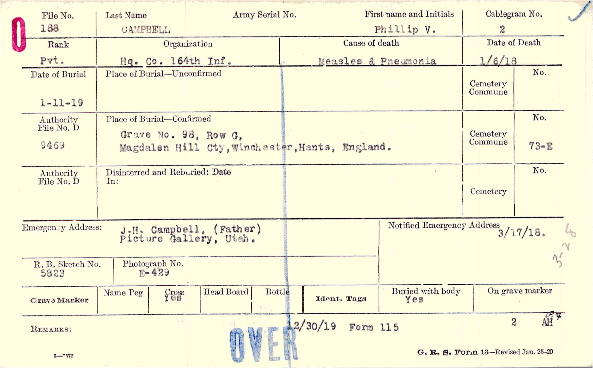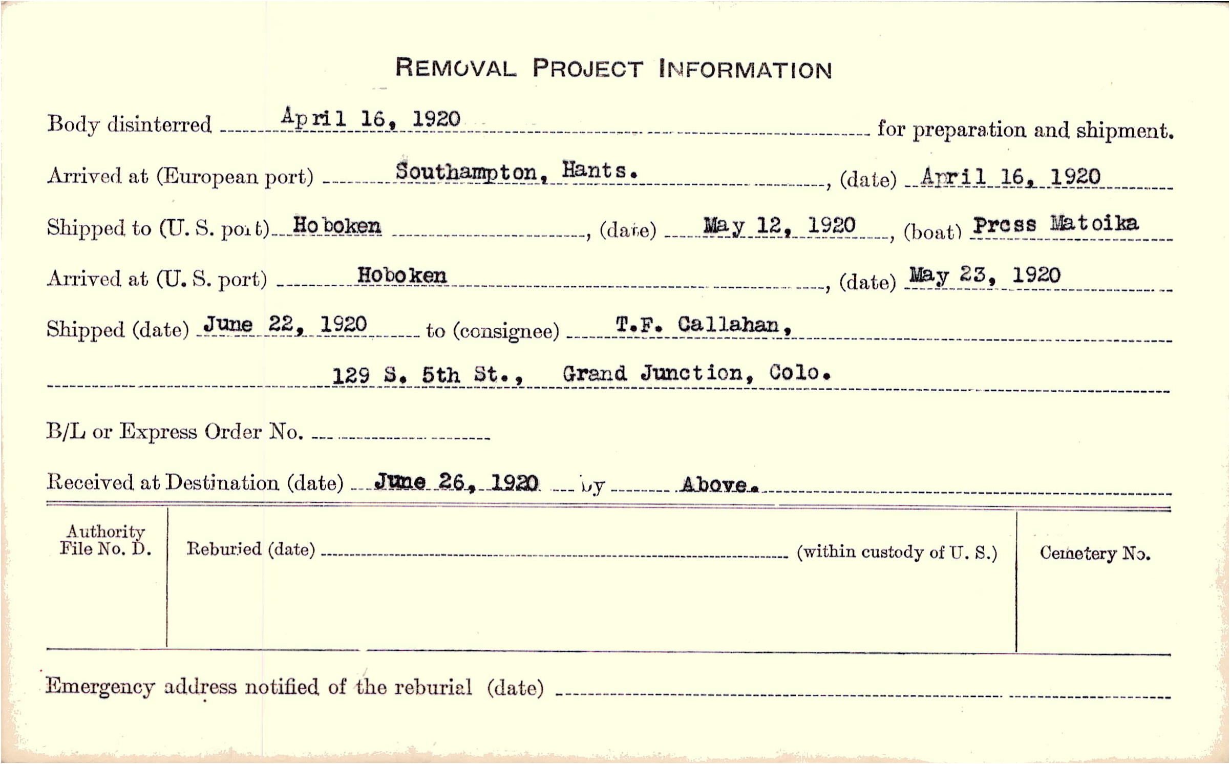 Body disinterred 4/16/1920 for preparation and shipment.