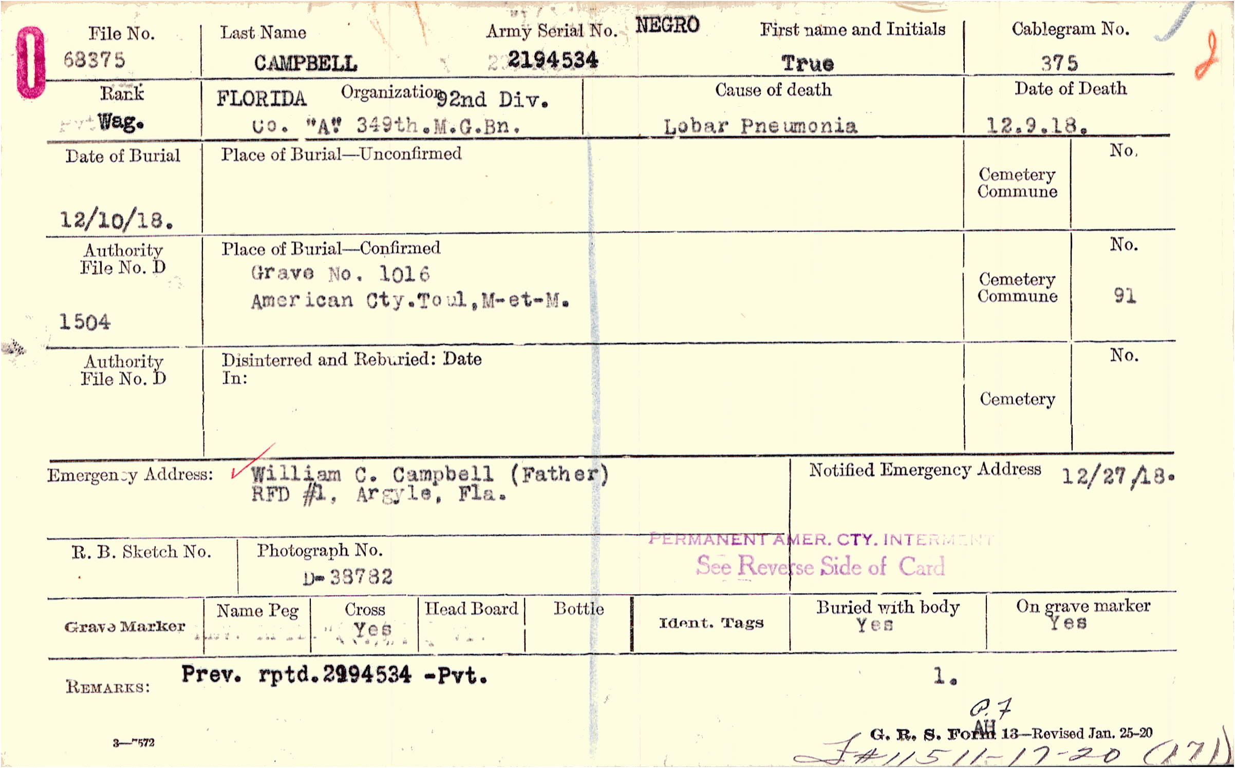 Grave 1016, American Cty., Toul, M-et-M