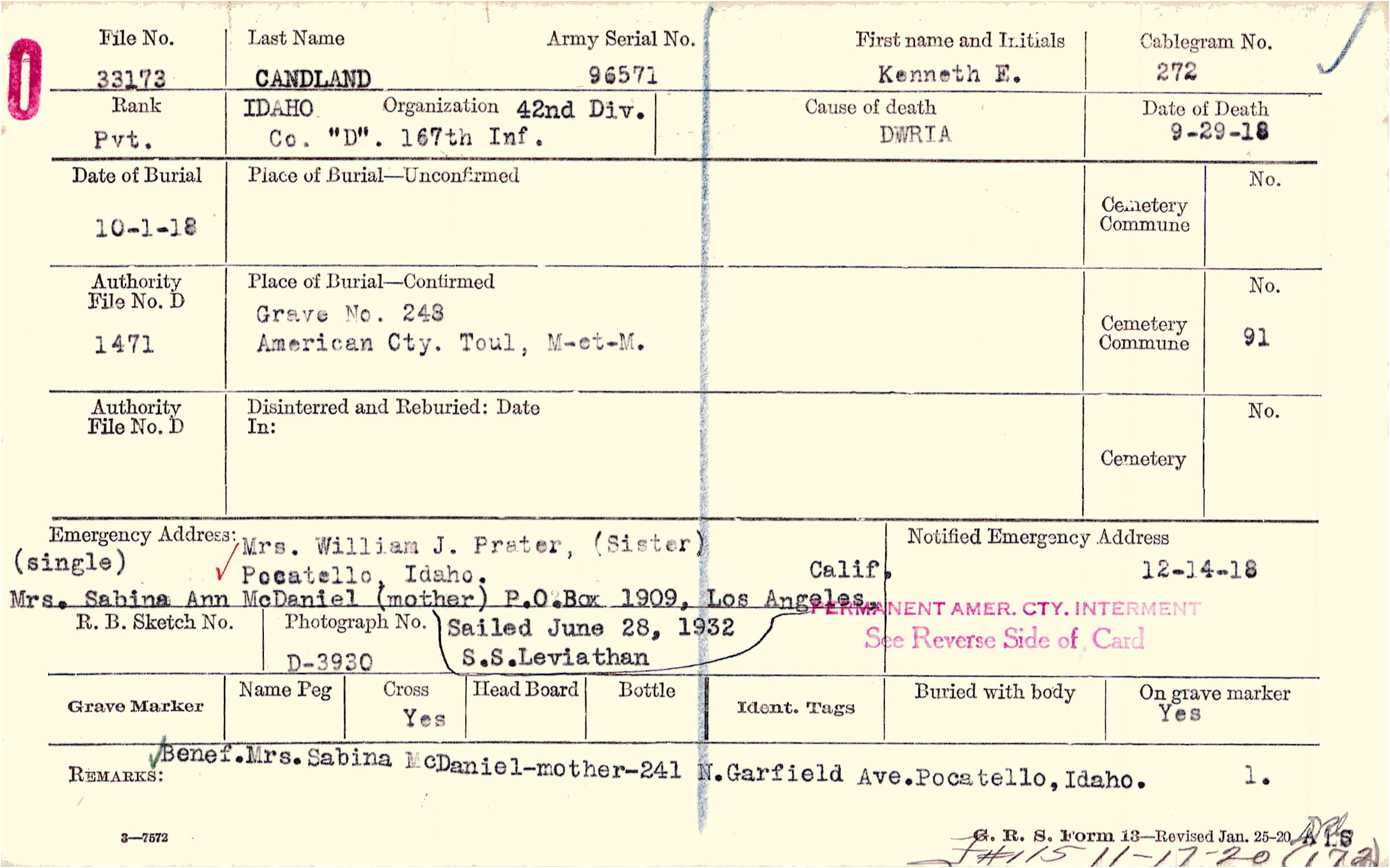 Mrs. William J. Prater, (Sister), Pocatello, Idaho., (single) Mrs. Sabina Ann McDaniel (mother) P.O. Box 1909, Los Angeles, Calif. Sailed June 28, 1932 S.S. Leviathan