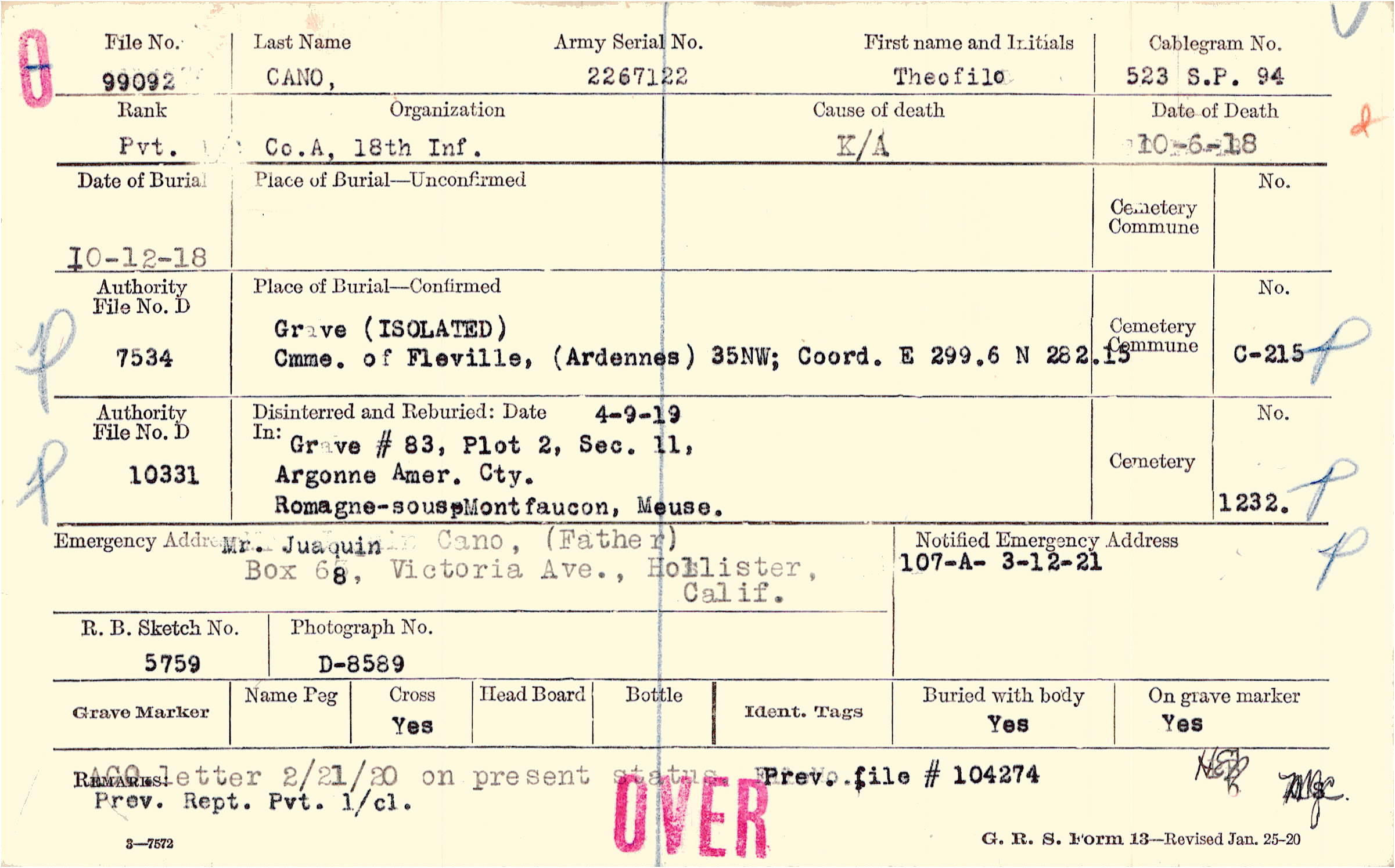 Mr. Juaquin Cano, (Father), Box 68, Victoria Ave., Hollister, Calif.