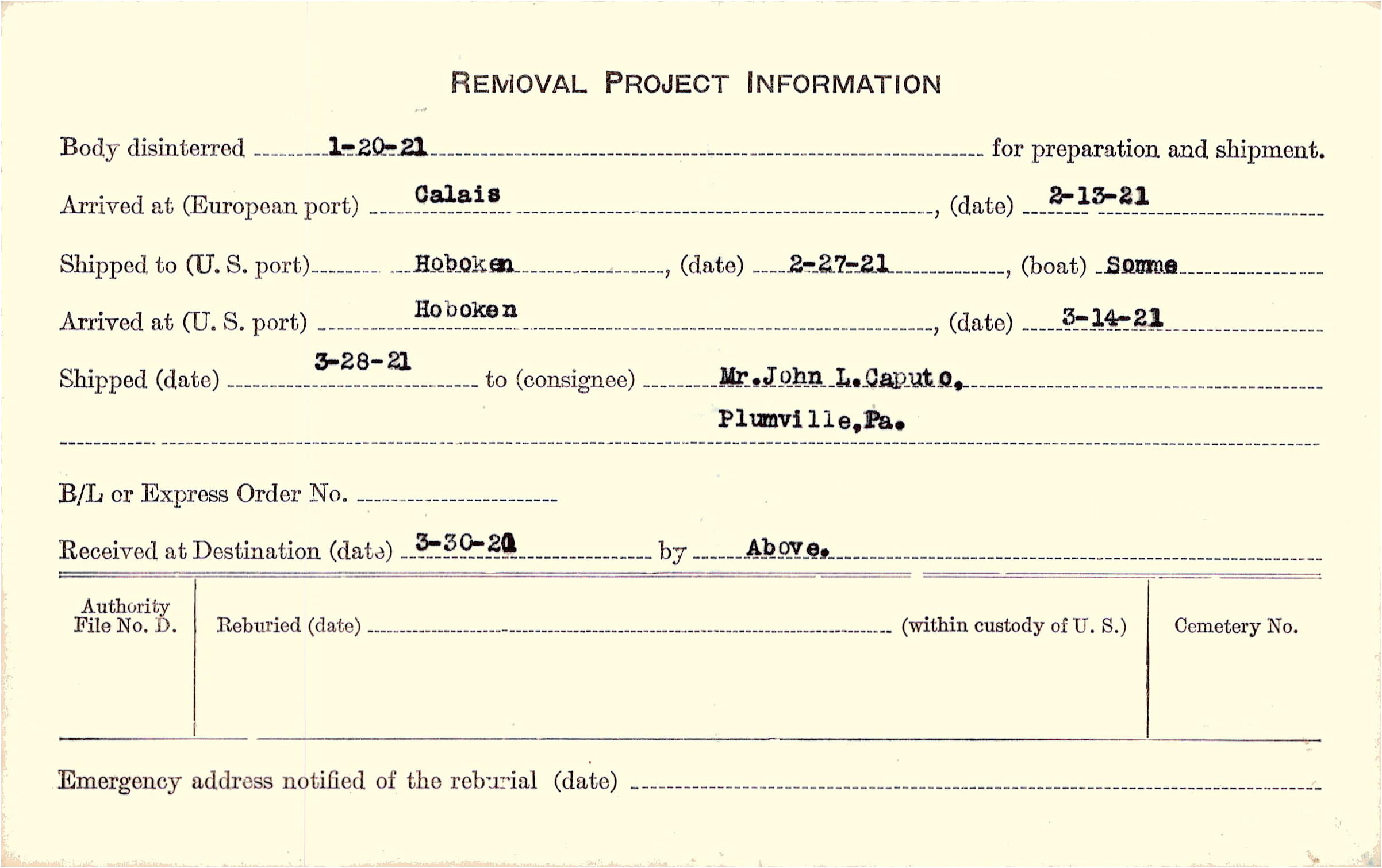 Body disinterred 1/20/1921 for preparation and shipment.