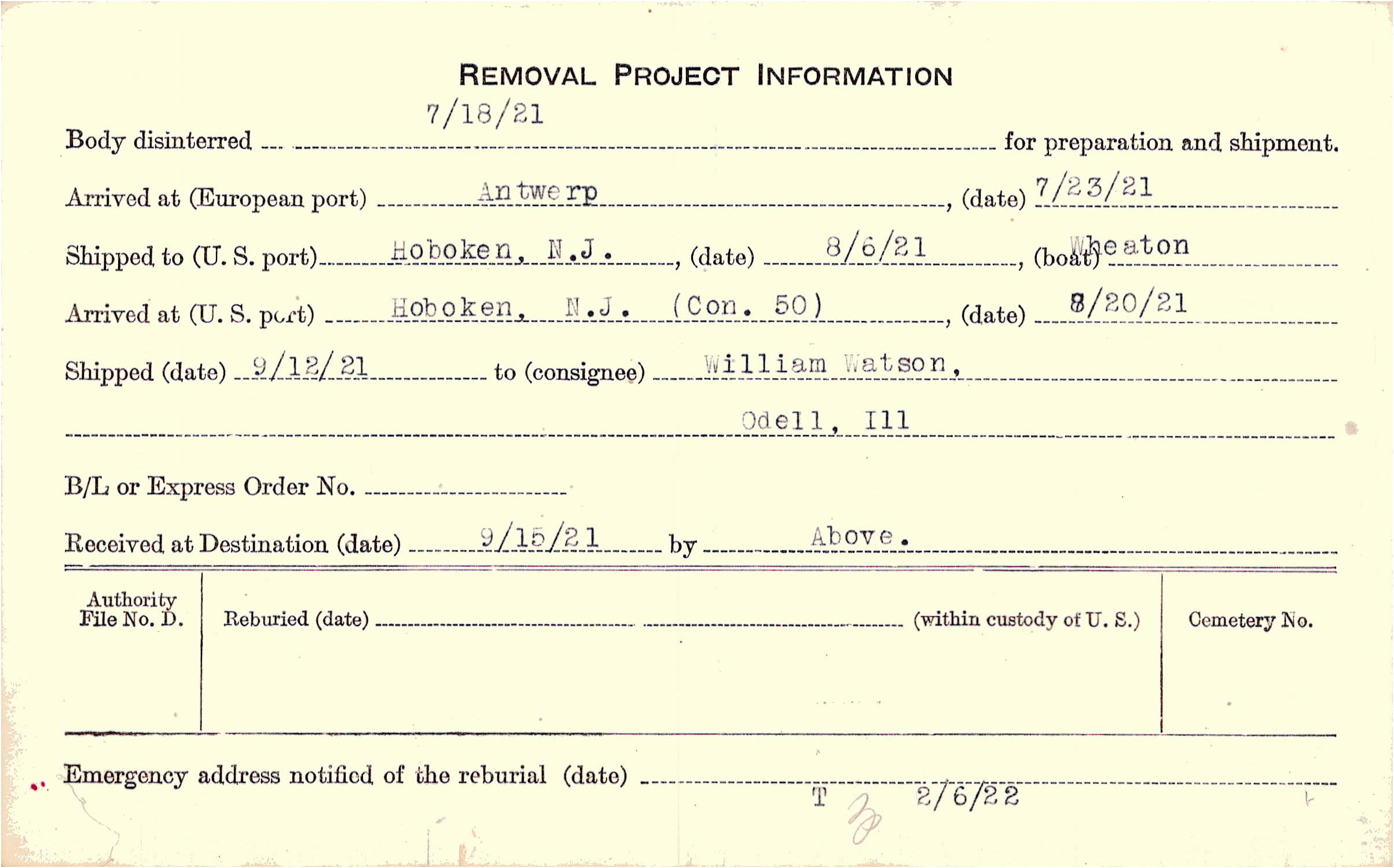 Body disinterred 7/18/1921 for preparation and shipment.