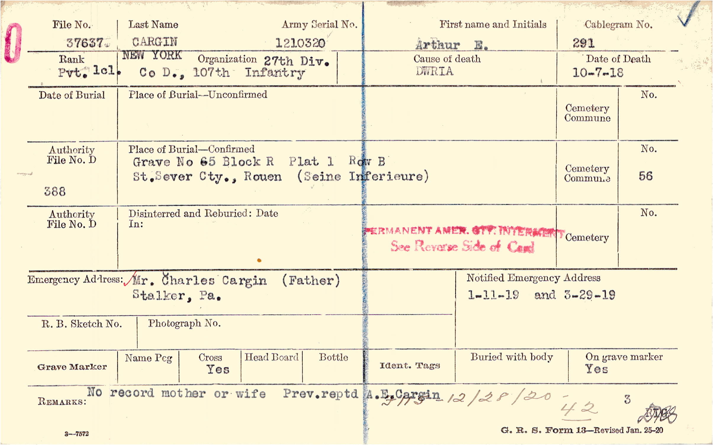 No record mother or wife Prev. reptd A.E. Cargin, F115 - 12/28/20 - 42