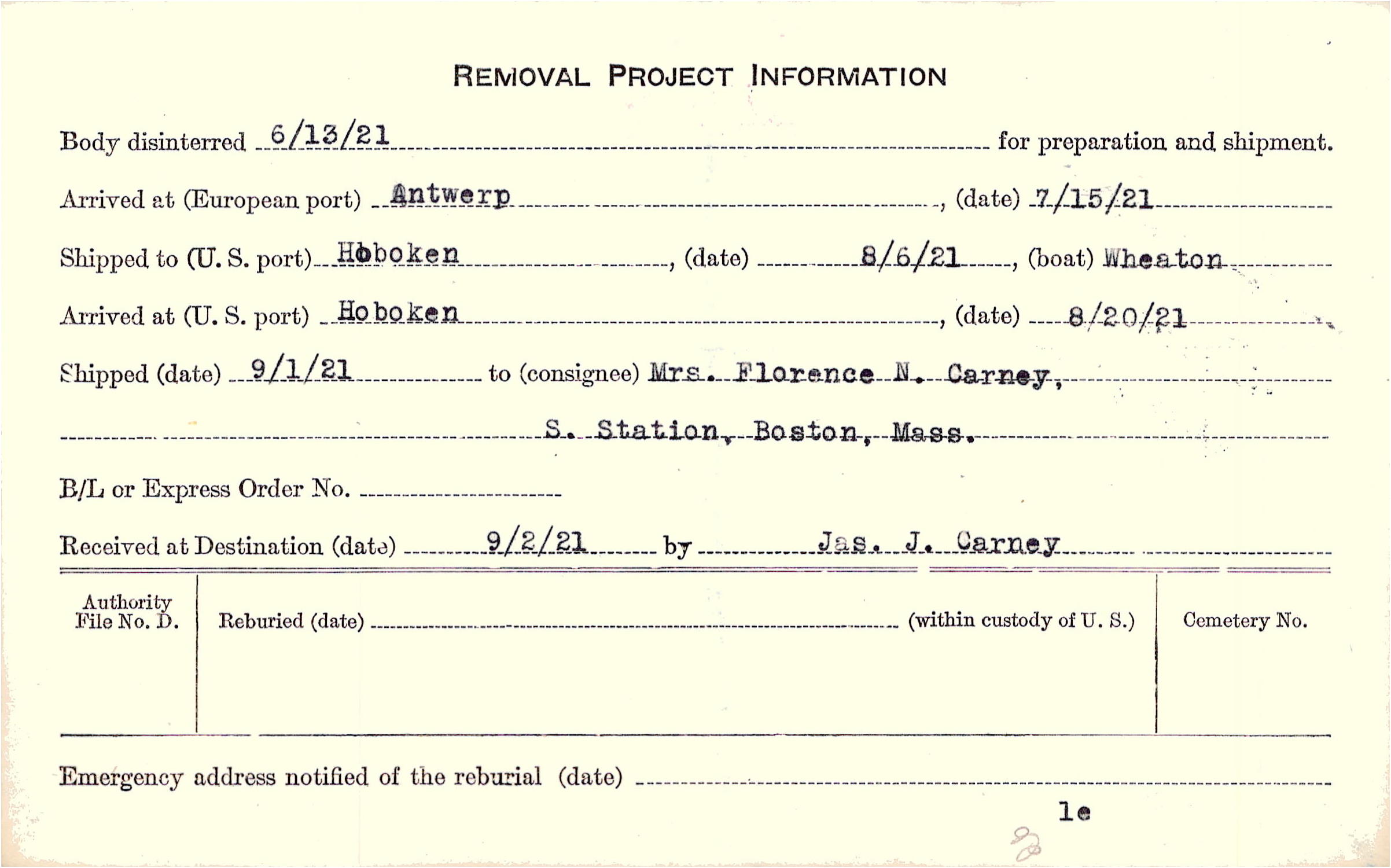 Mrs. O.J. Carney, (wife), Apt. 37, 709 West 169th St., New York, N.Y., Beneficiary : Mrs. Florence Maude Garney, (widow) 182 Grove St., Melrose, Mass.