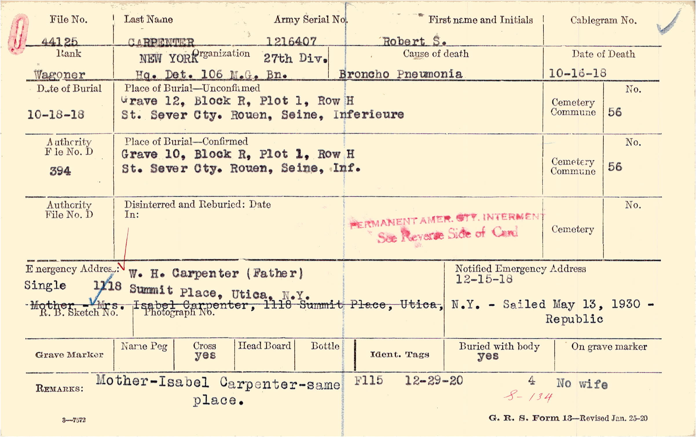 W. H. Carpenter (Father), 1118 Summit Place, Utica, N.Y., Single Mother - Mrs. Isabel Carpenter, 1118 Summit Place, Utica, N.Y. - Sailed May 13, 1930 - Republic