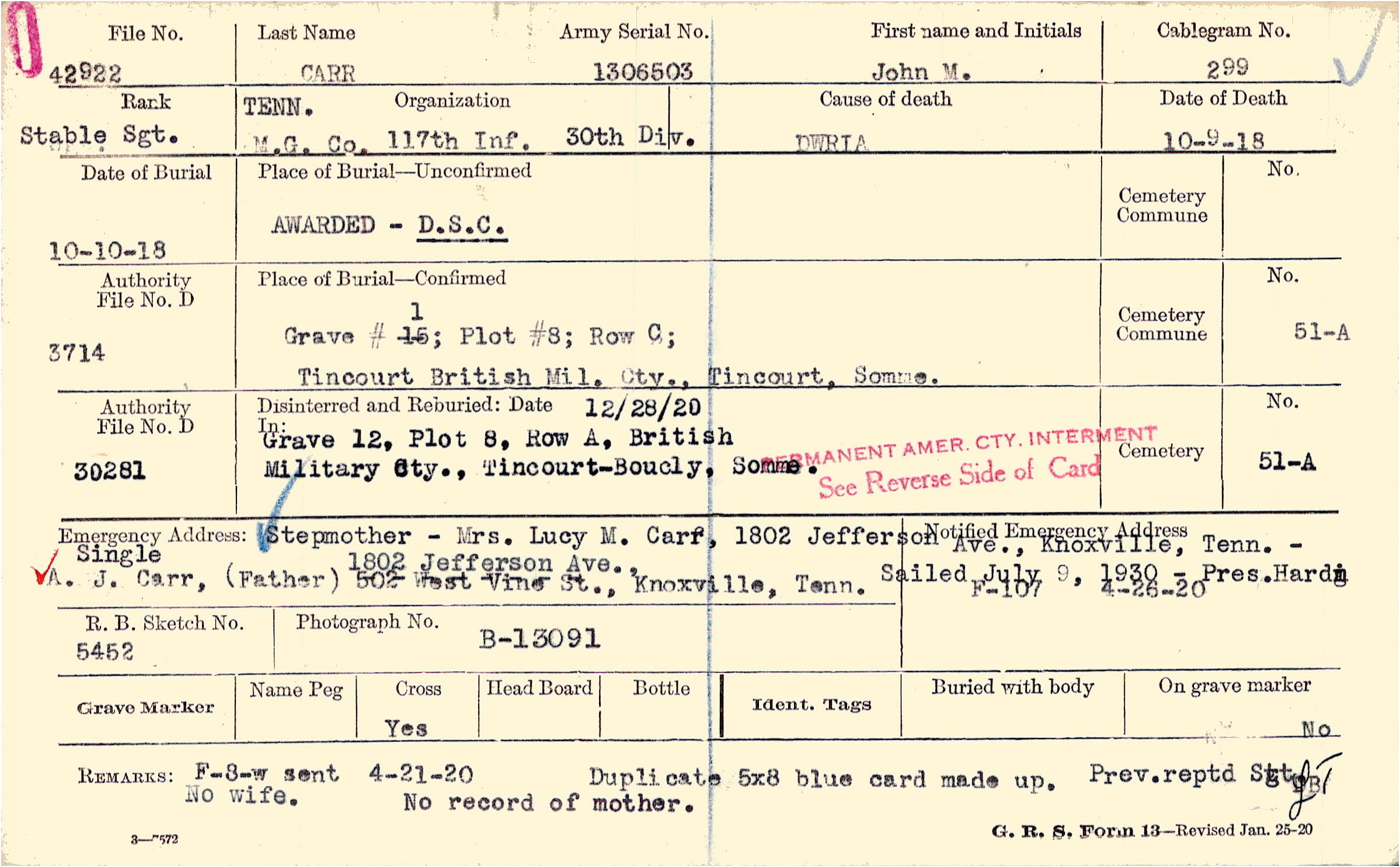 Duplicate 5x8 blue card made up Prev. reptd Sgt. No wife No record of mother, F-8-w sent 4-21-20