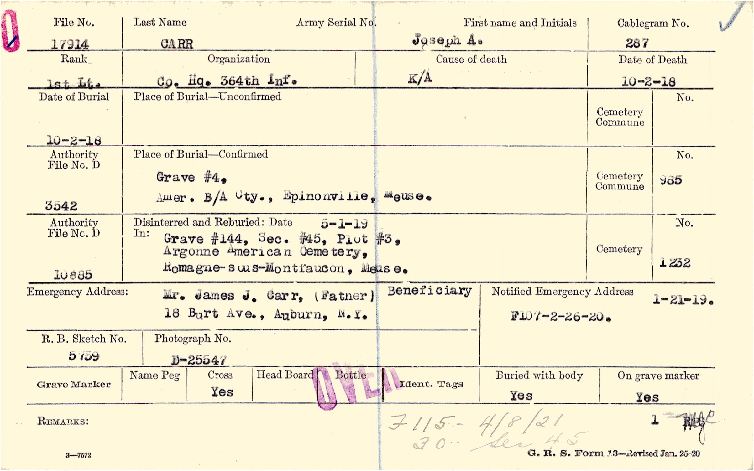 Mr. James J. Carr, (Father), 18 Burt Ave., Auburn, N.Y., Beneficiary