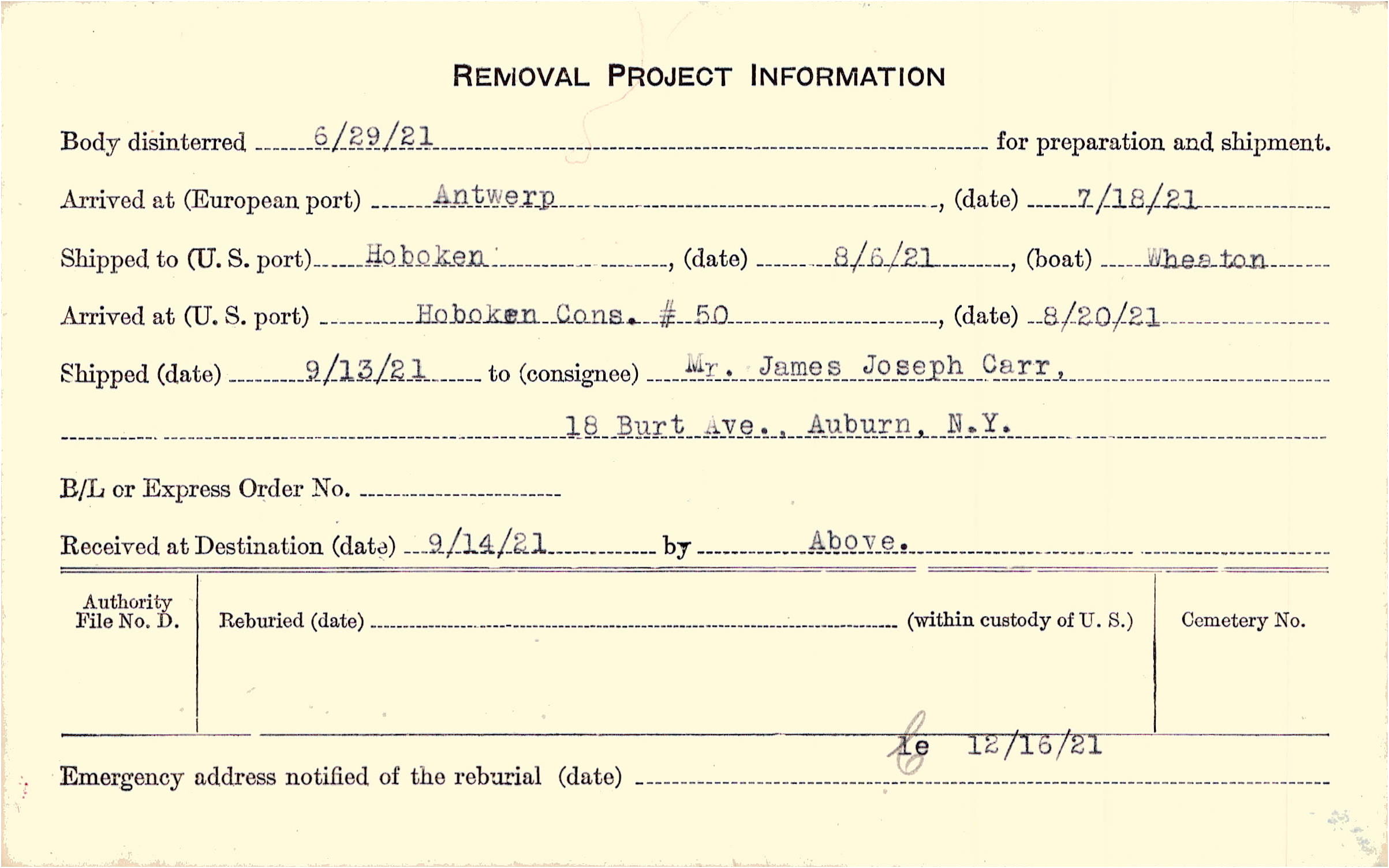Body disinterred 6/29/1921 for preparation and shipment.