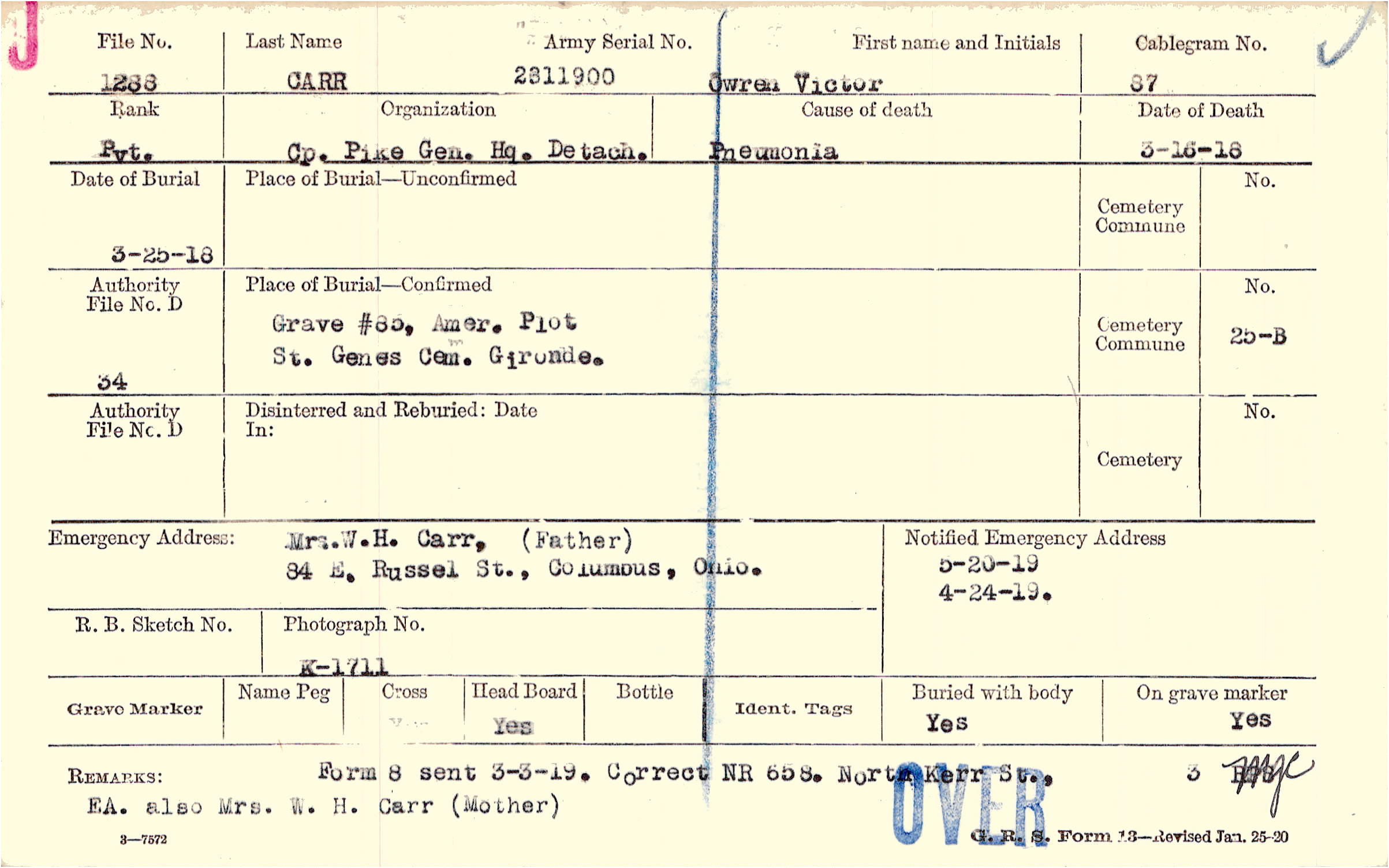Mr. W.H. Carr, (Father), 84 E. Russel St., Columbus, Ohio.