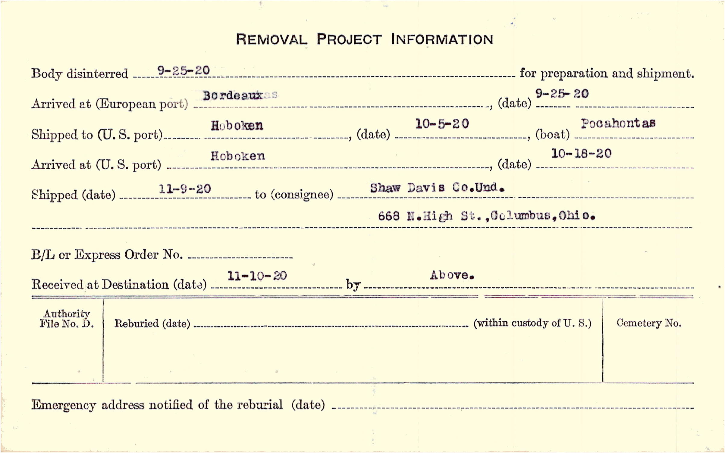 Body disinterred 9/25/1920 for preparation and shipment.