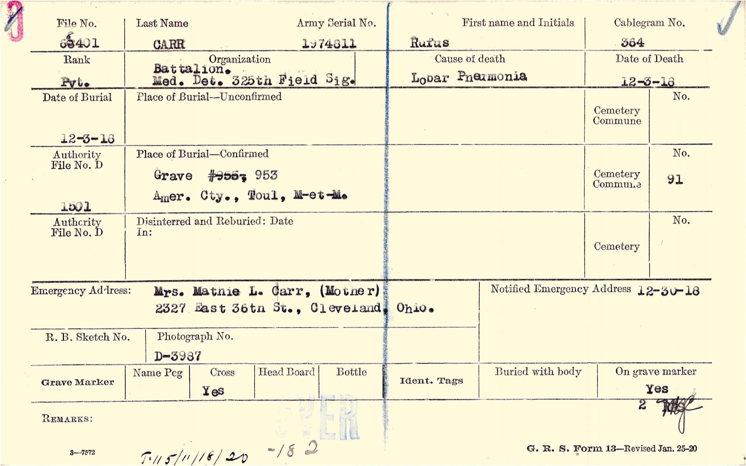 Grave # 953, Amer. Cty., Toul, M-et-M.