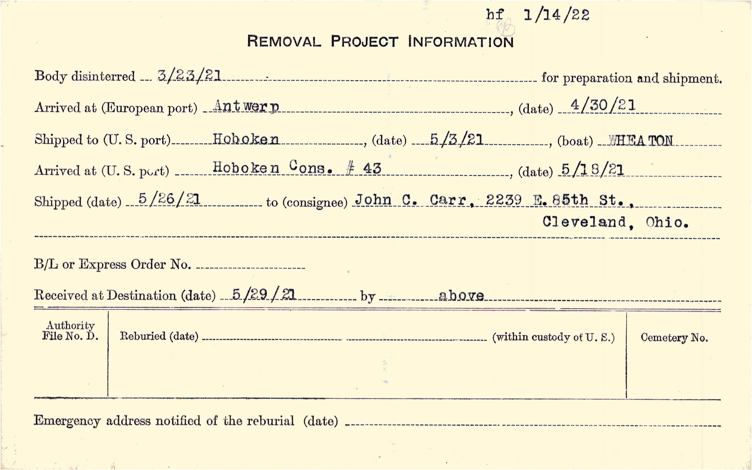 Body disinterred 3/23/1921 for preparation and shipment.