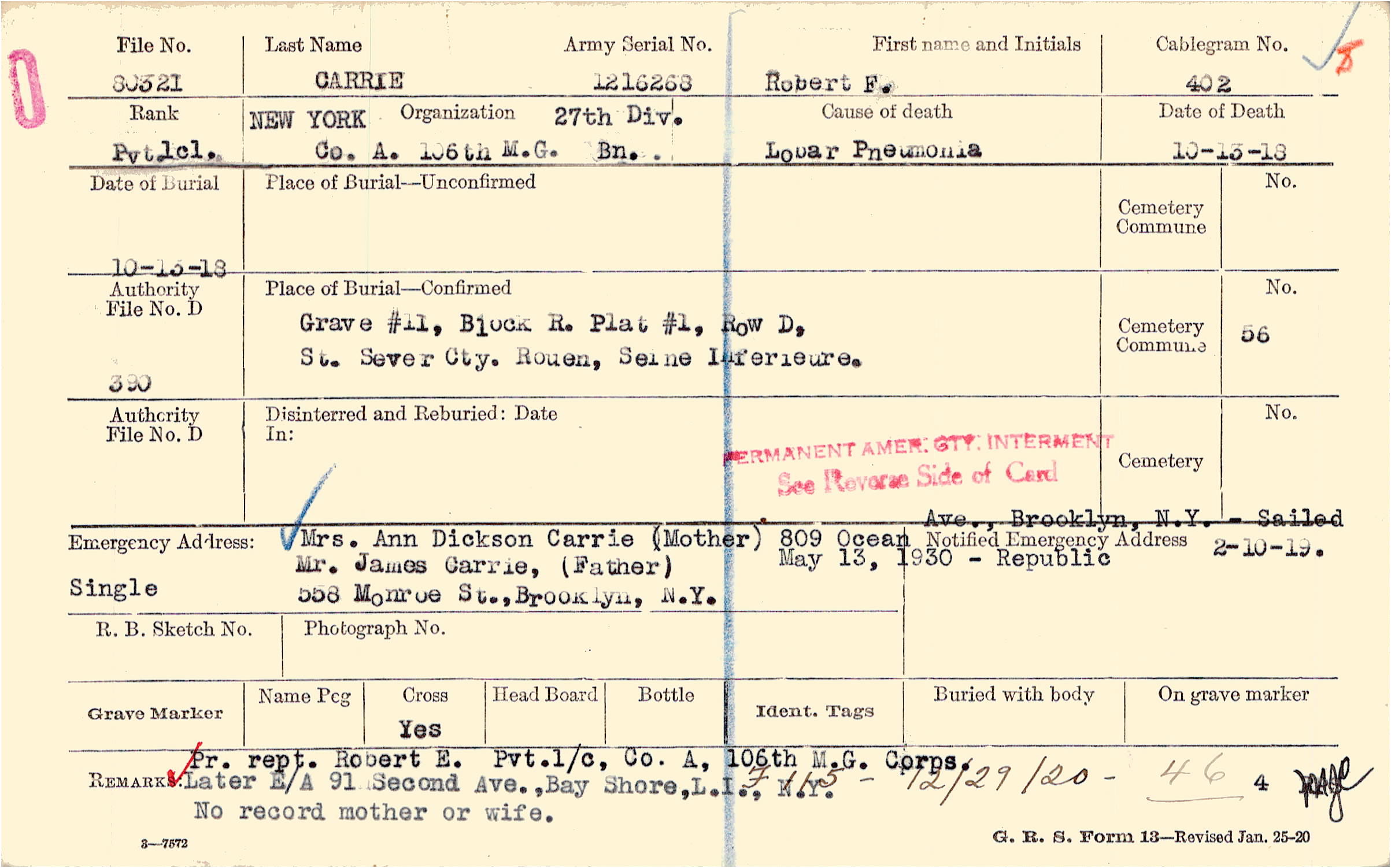 Grave #11, Block R, Plat #1, Row D, St. Sever Cty., Rouen, Seine Inferieure