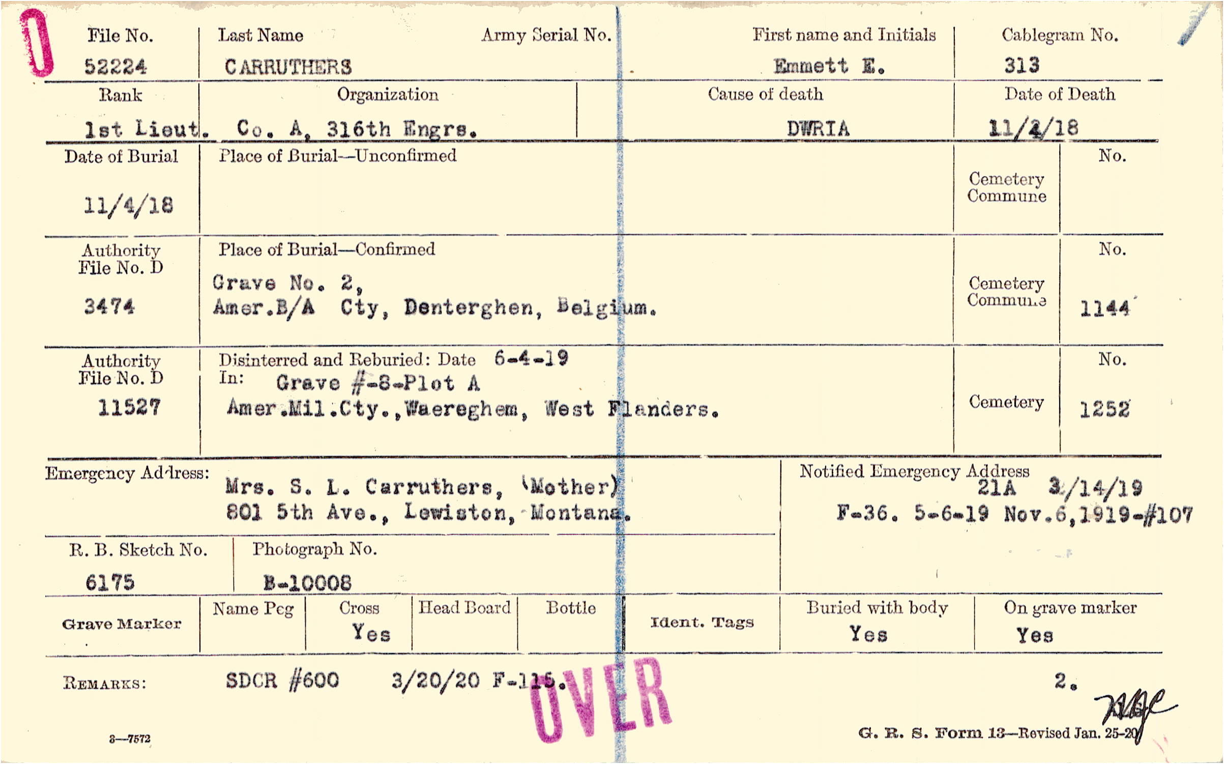 Mrs. S. L. Carruthers, (Mother), 801 5th Ave., Lewiston, Montana.