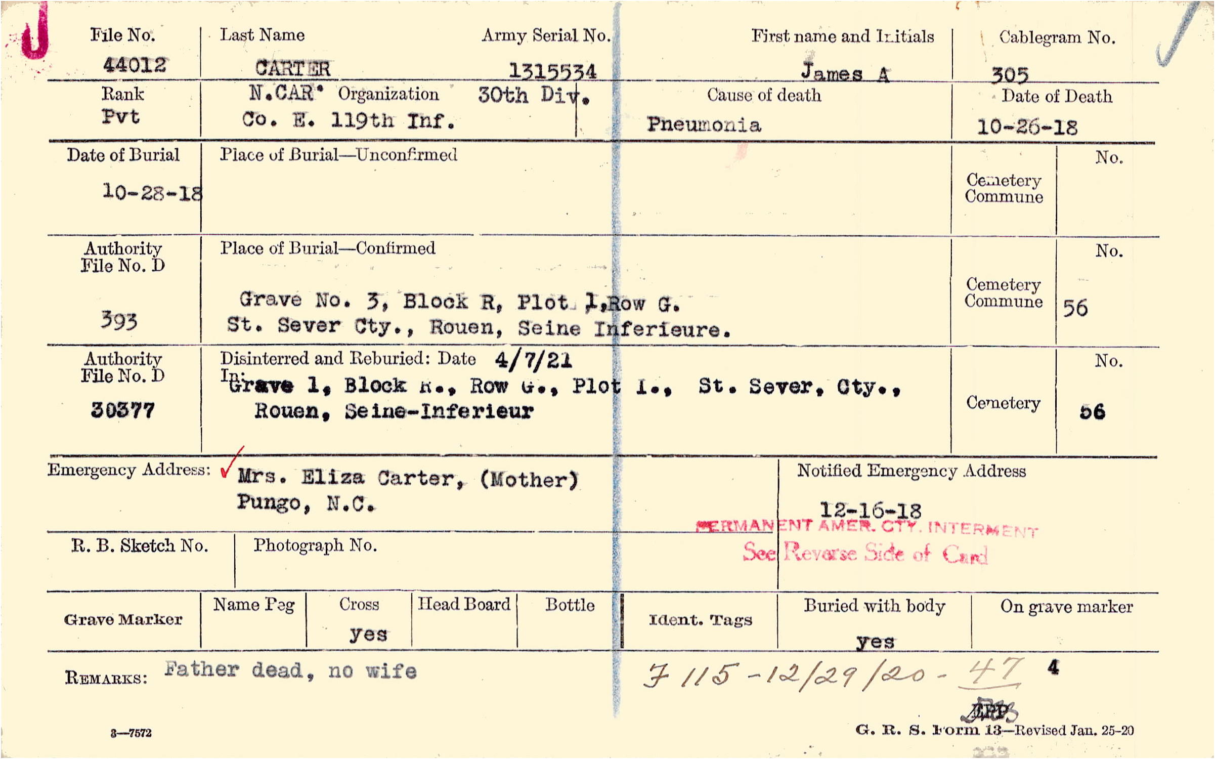 Grave 3, Block R, Plot 1,Row G., St. Sever Cty., Rouen, Seine Inferieure.