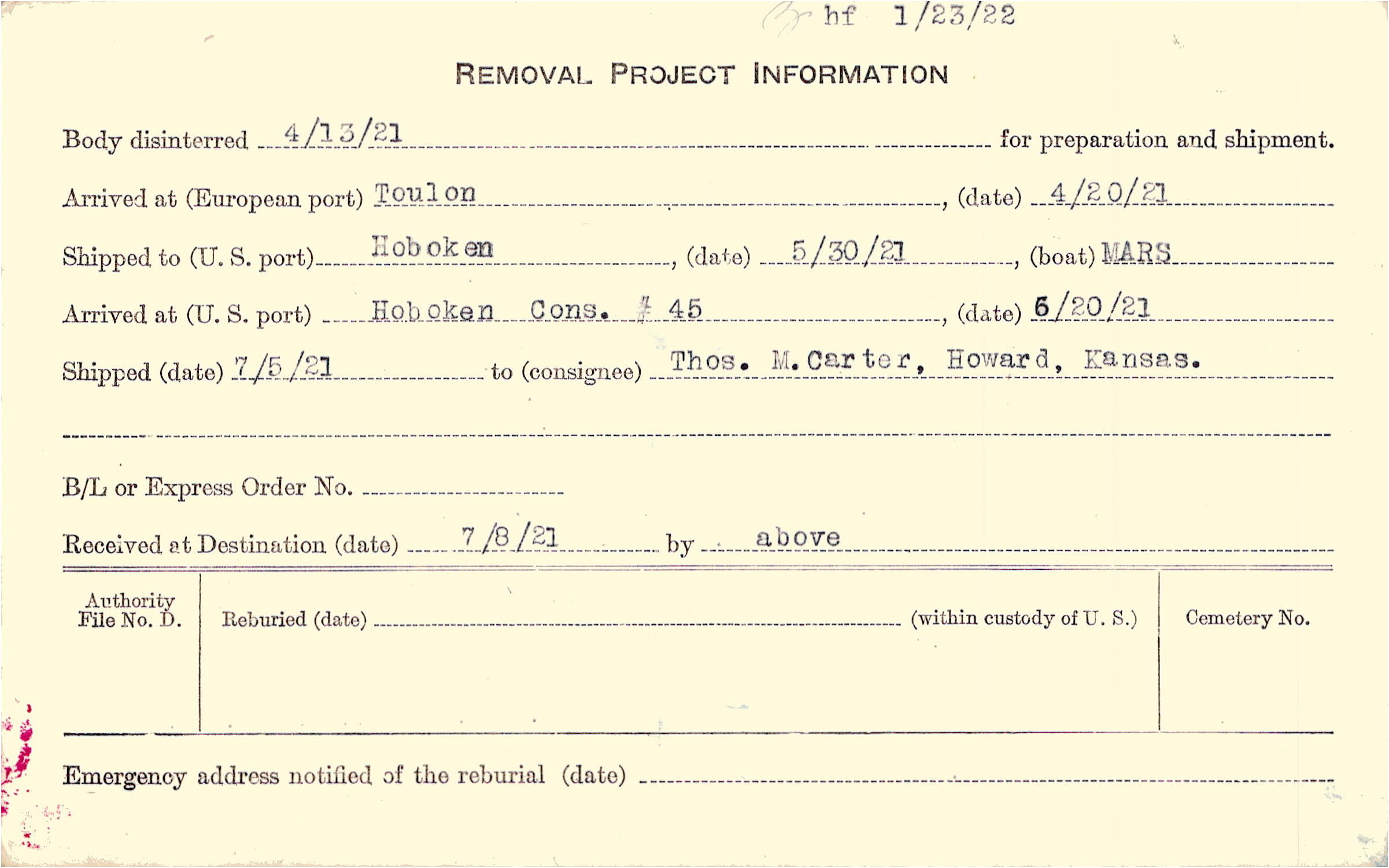 Body disinterred 4/13/1921 for preparation and shipment.