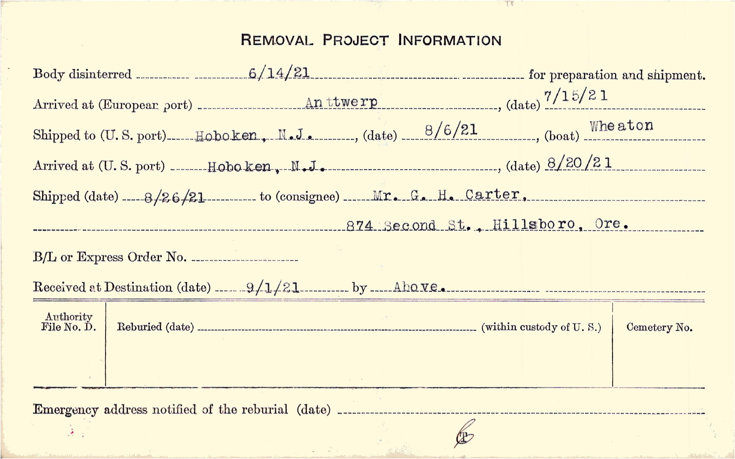 Body disinterred 6/14/1921 for preparation and shipment.