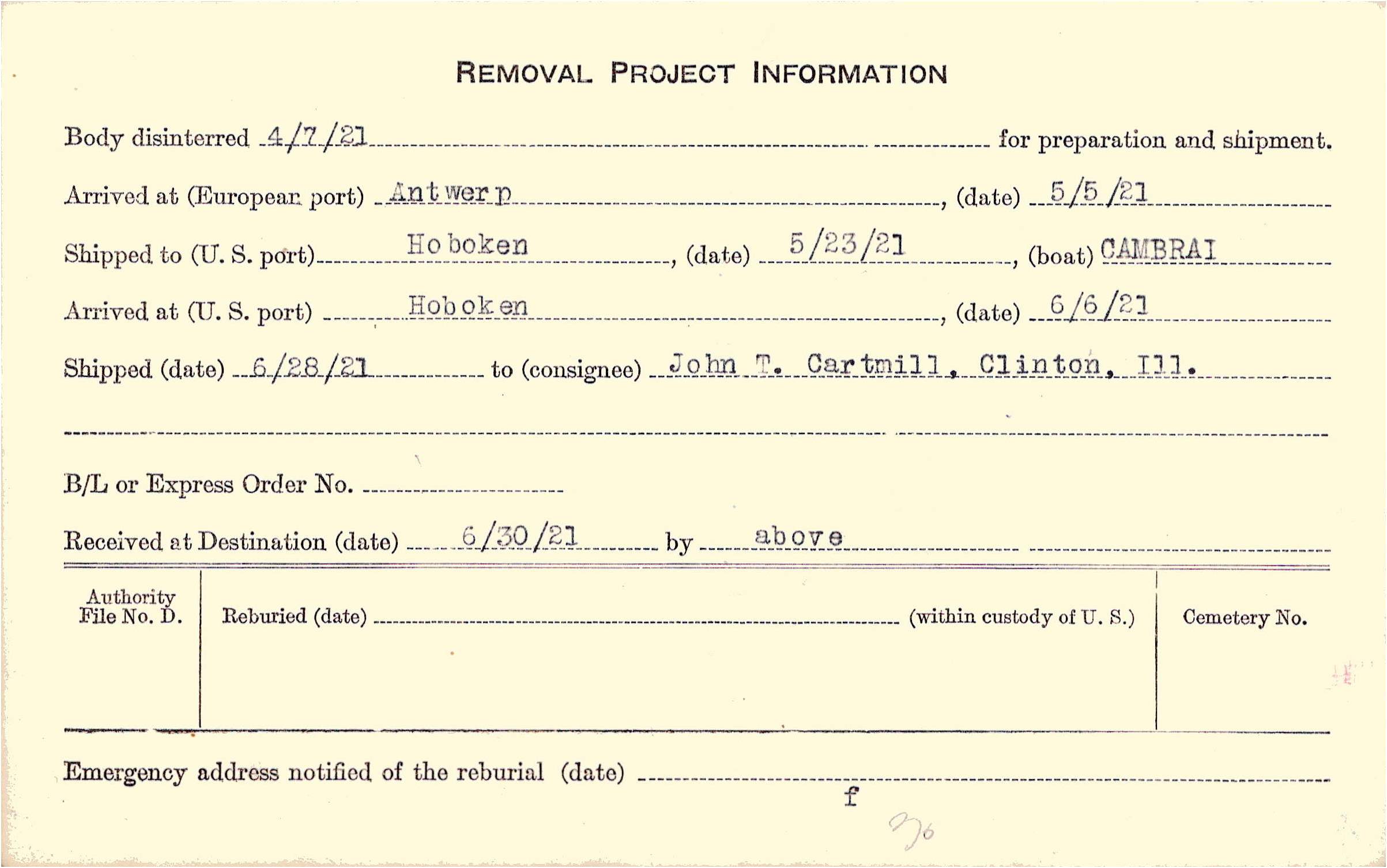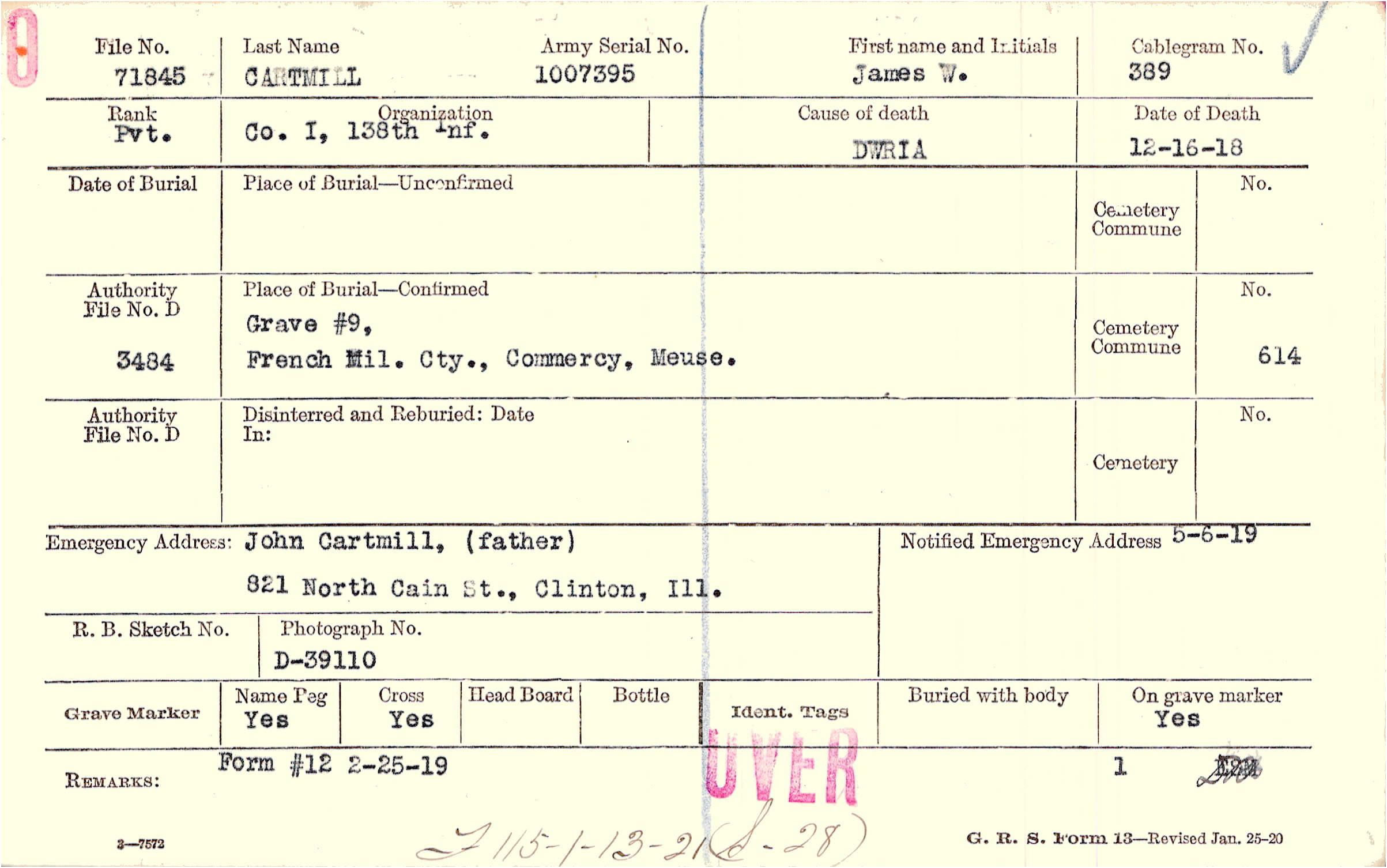 John Cartmill, (father), 821 North Cain St., Clinton, Ill.