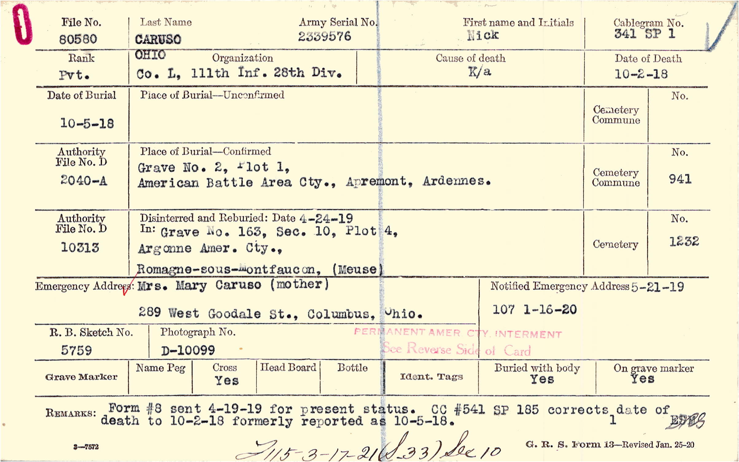 Mrs. Mary Caruso (mother), 289 West Goodale St., Columbus, Ohio.