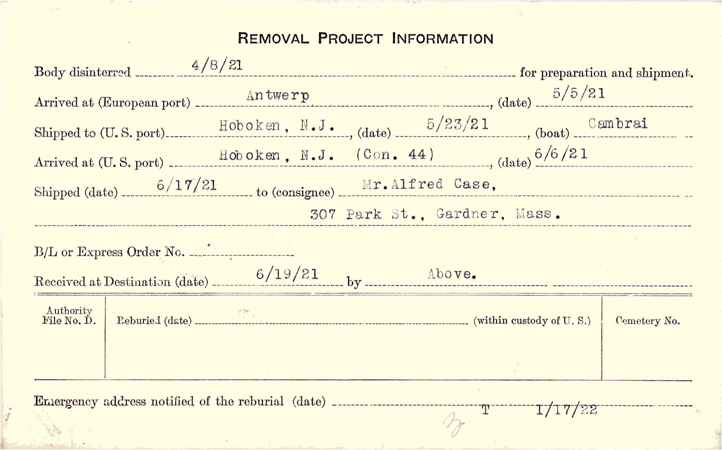Body disinterred 4/8/1921 for preparation and shipment.