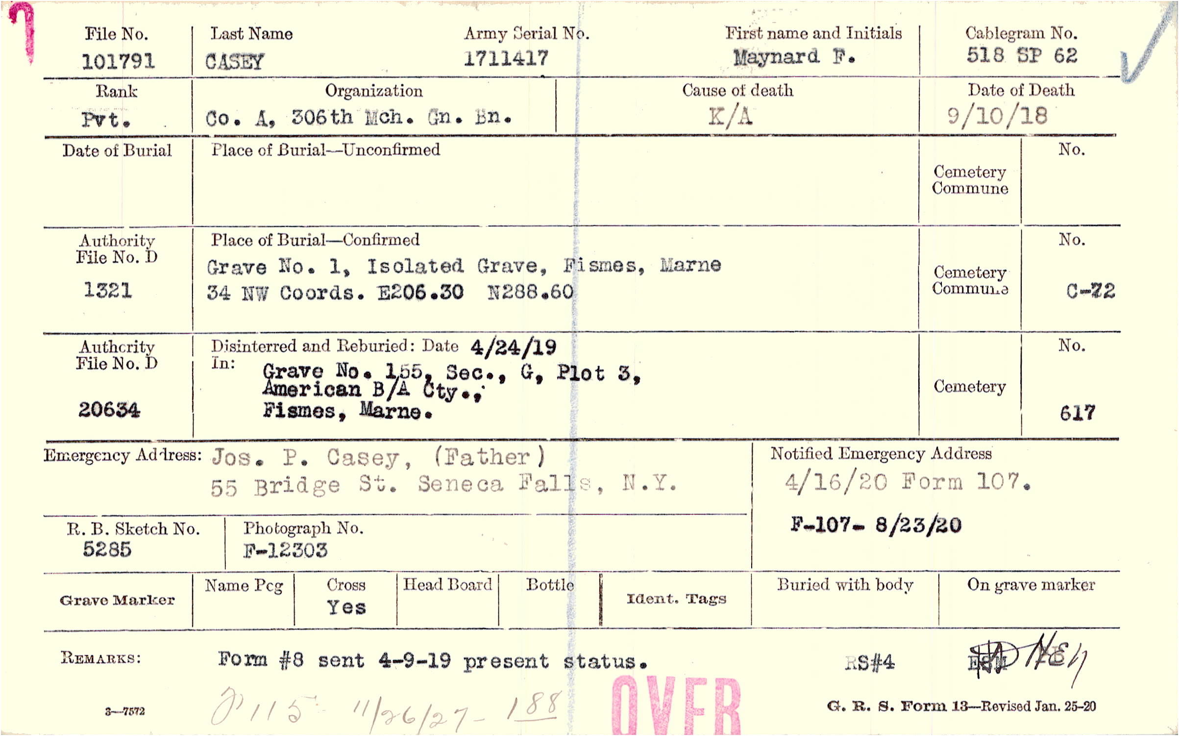 Jos. P. Casey, (Father), 55 Bridge St. Seneca Falls, N.Y.