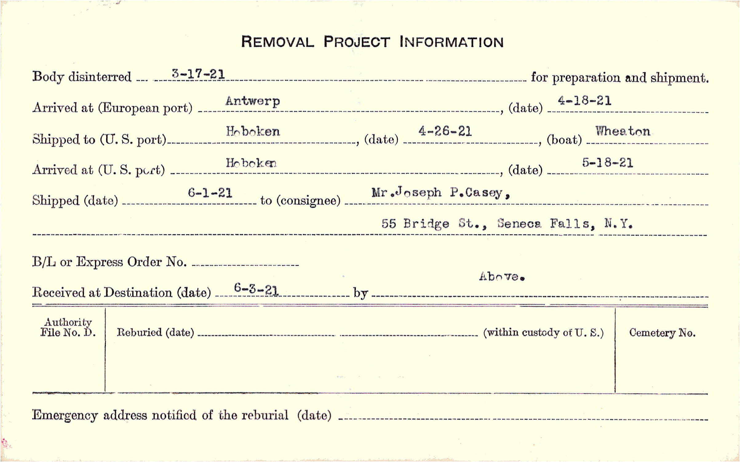 Body disinterred 3/17/1921 for preparation and shipment.