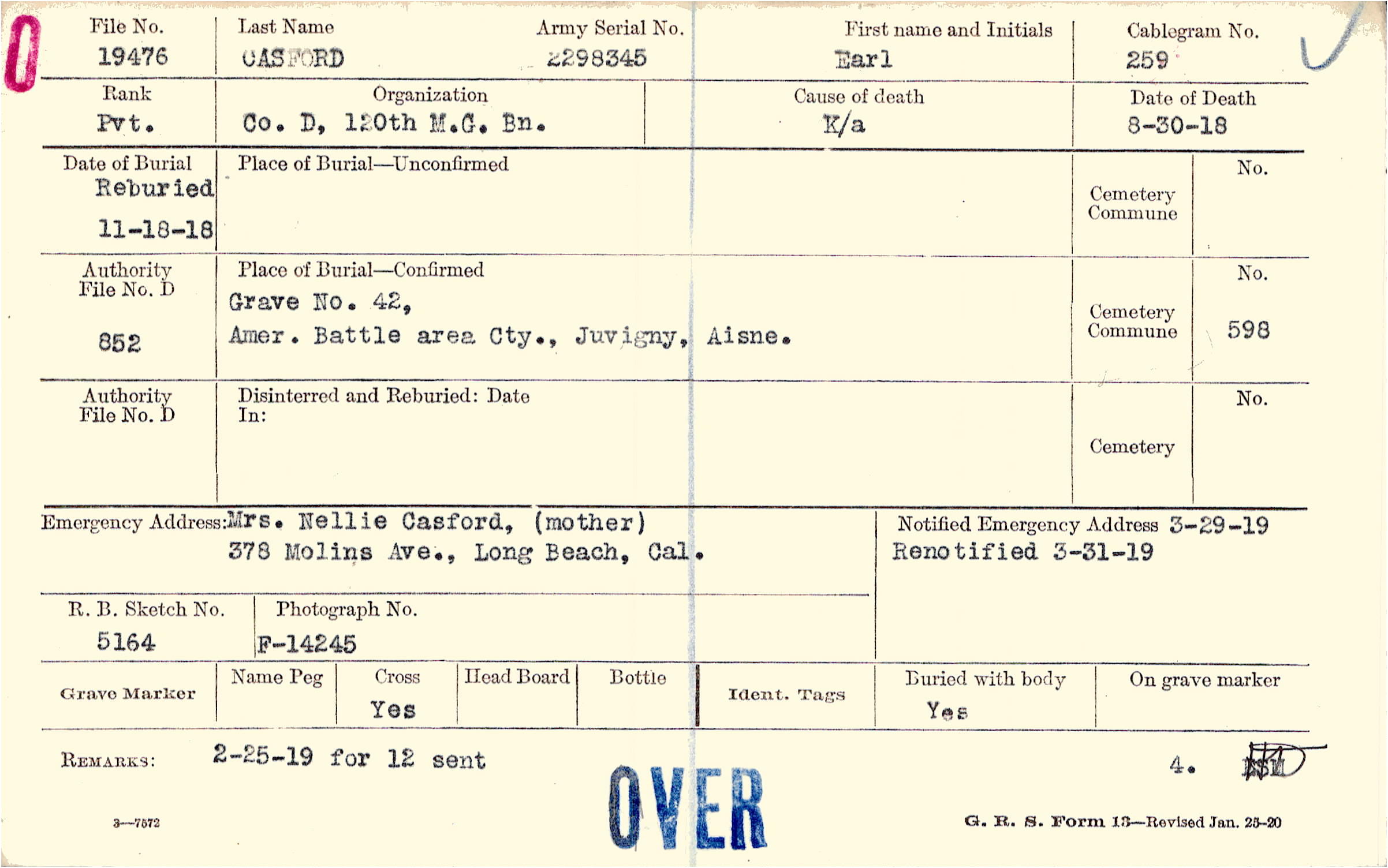 Mrs. Nellie Casford, (mother), 378 Molins Ave., Long Beach, Cal.