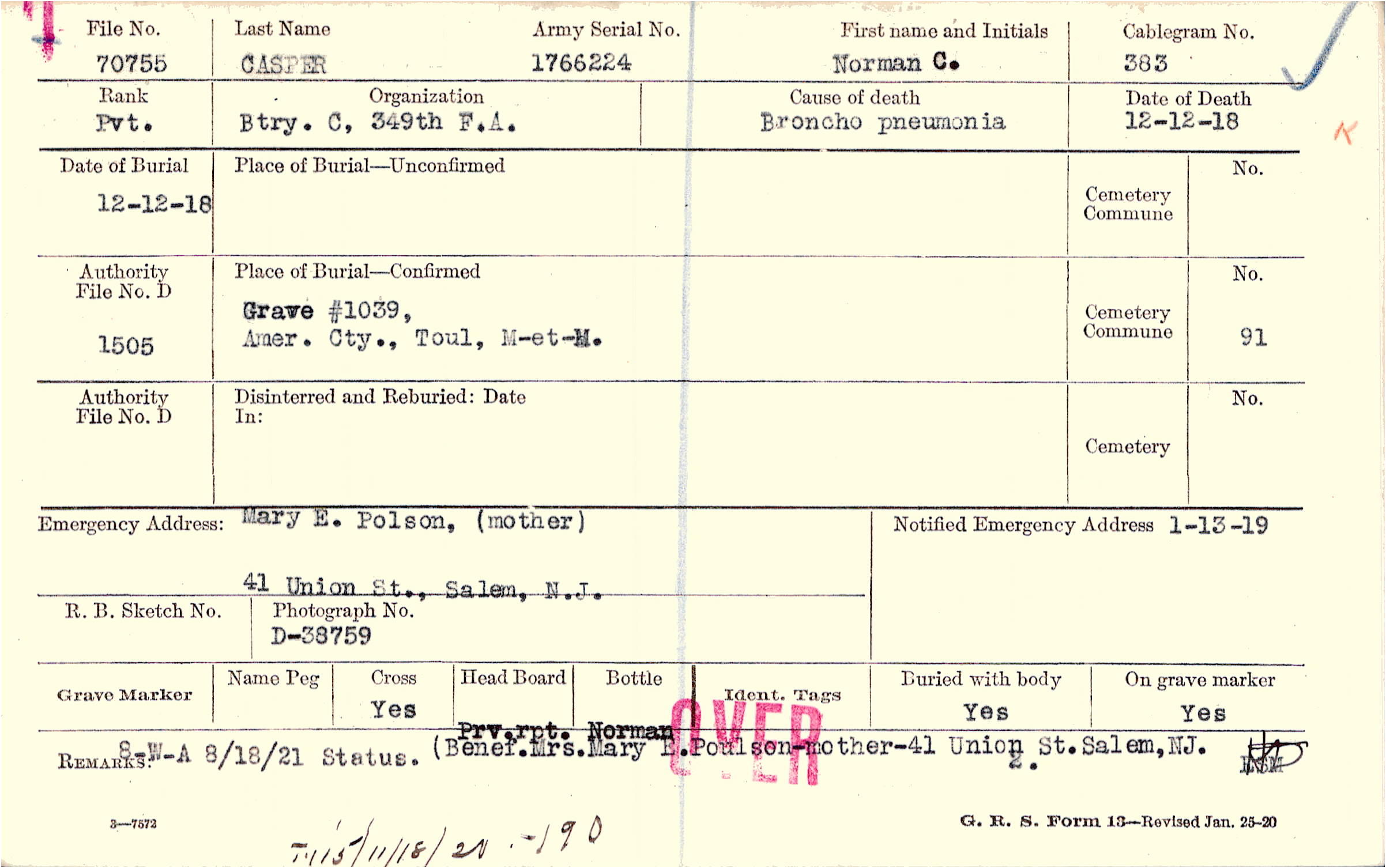 Status. Prv. rpt. Norman. (Beneficiary Mrs. Mary E. Poulson-mother-41 Union St. Salem, NJ., 8-W-A 8/18/21 Status., F115 / 11/18/20 - 190