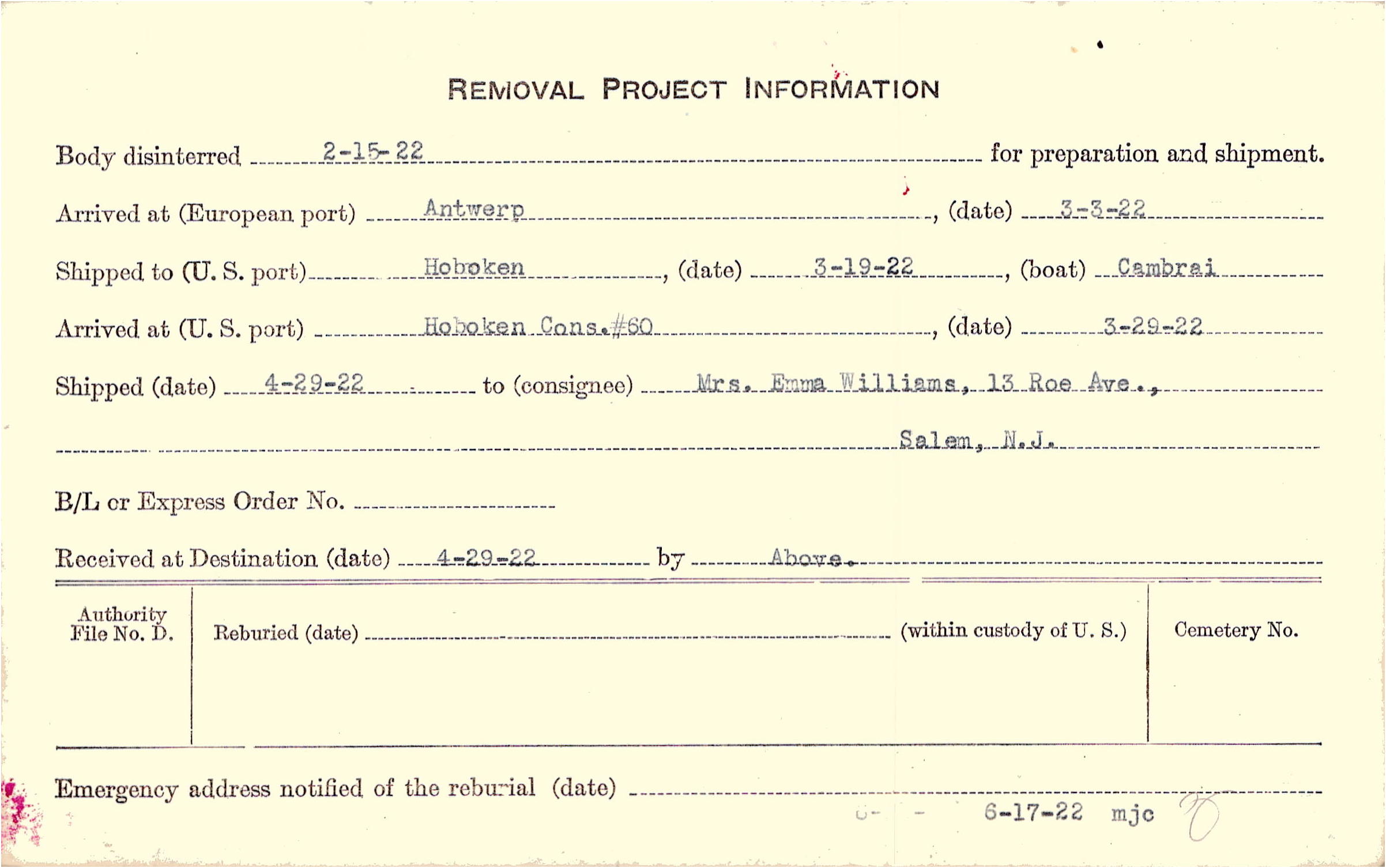 | Emergency address notified on 6/17/1922 |