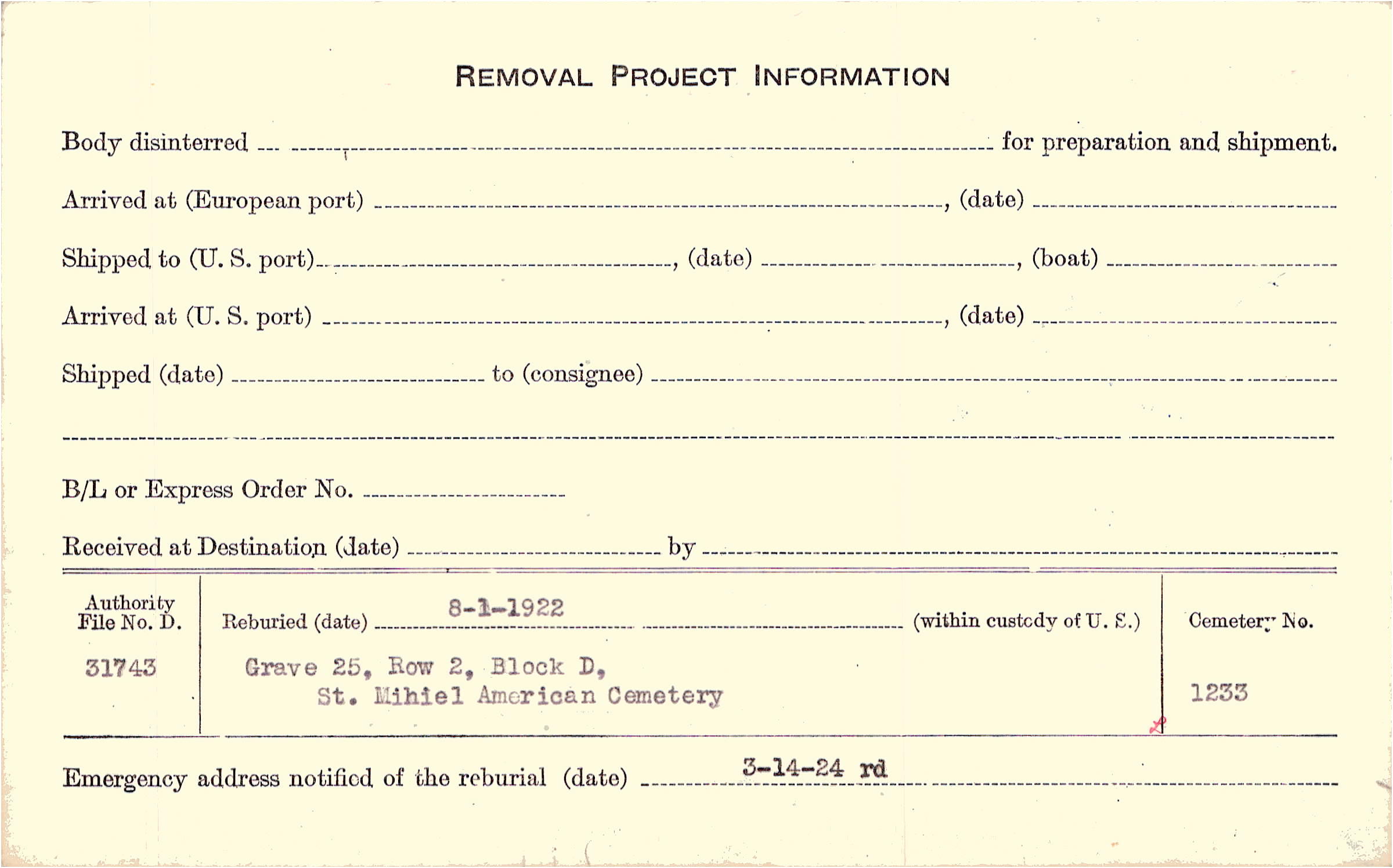 | Permanent Burial in Foreign Cemetery |