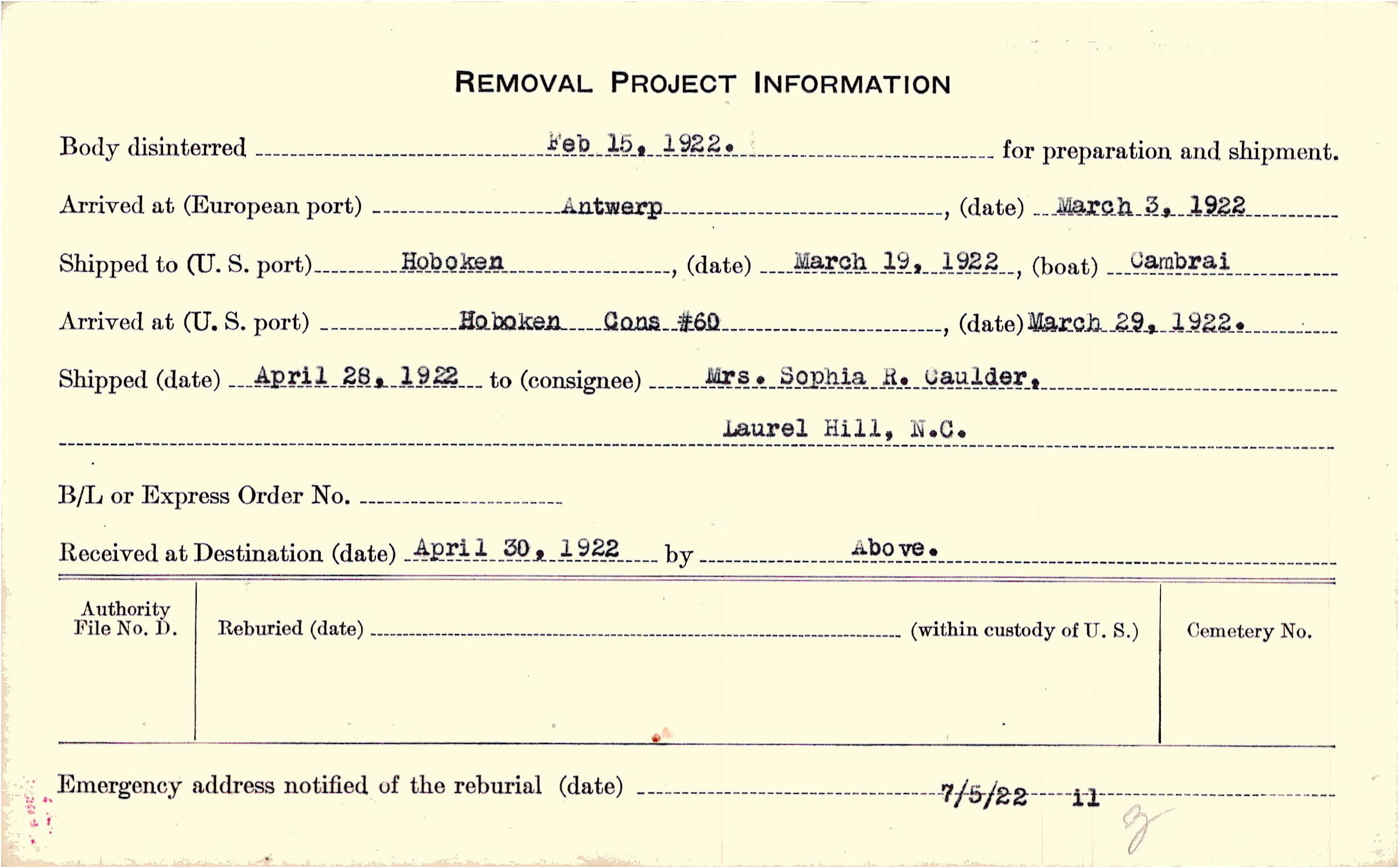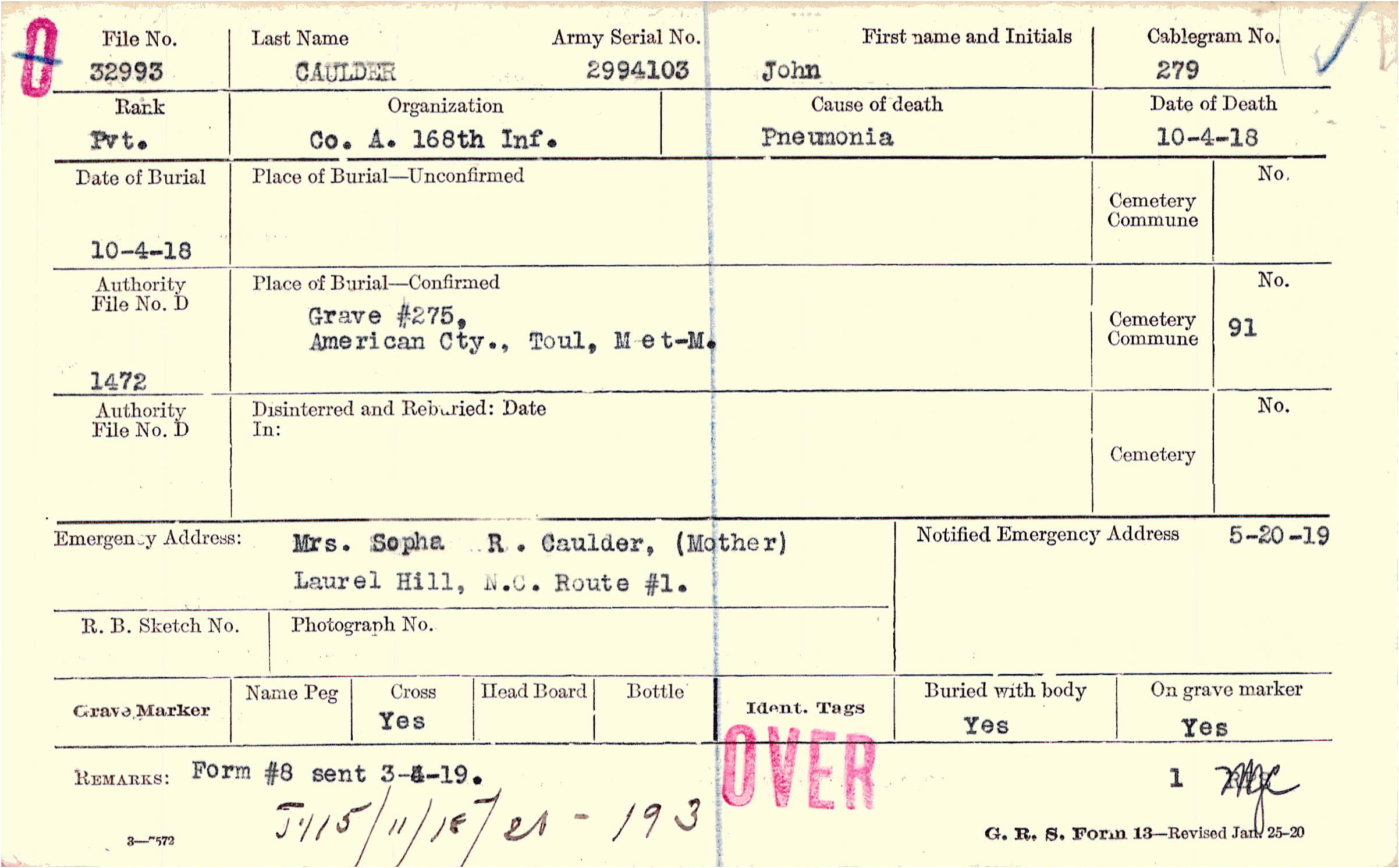 Mrs. Sopha R. Caulder, (Mother), Laurel Hill, N.C. Route #1.