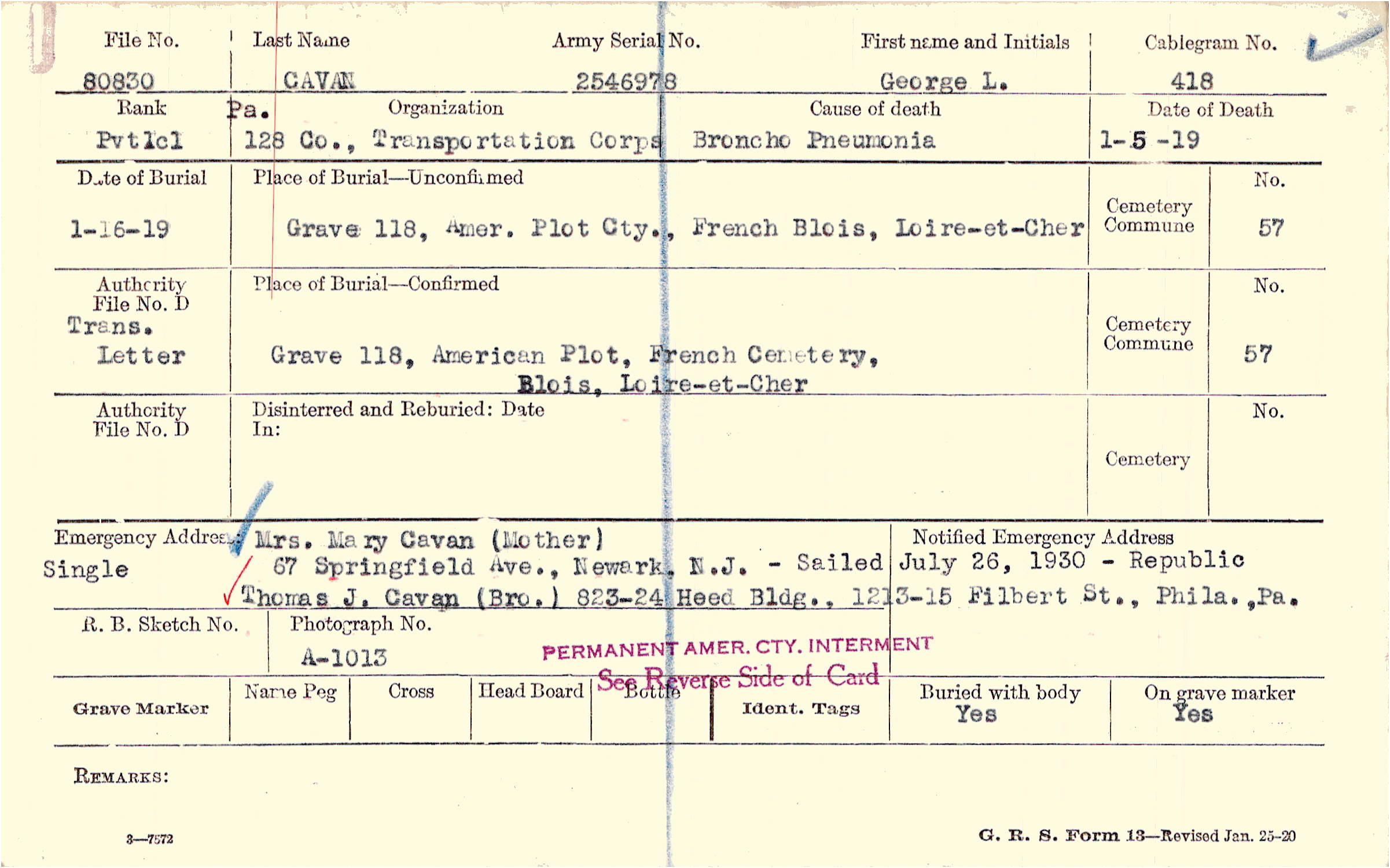 Mrs. Mary Cavan (Mother), 67 Springfield Ave., Newark, N.J., Single - Sailed July 26, 1930 - Republic Thomas J. Cavan (Bro.) 82324 Heed Bldg., 1213-15 Filbert St., Phila.,Pa.