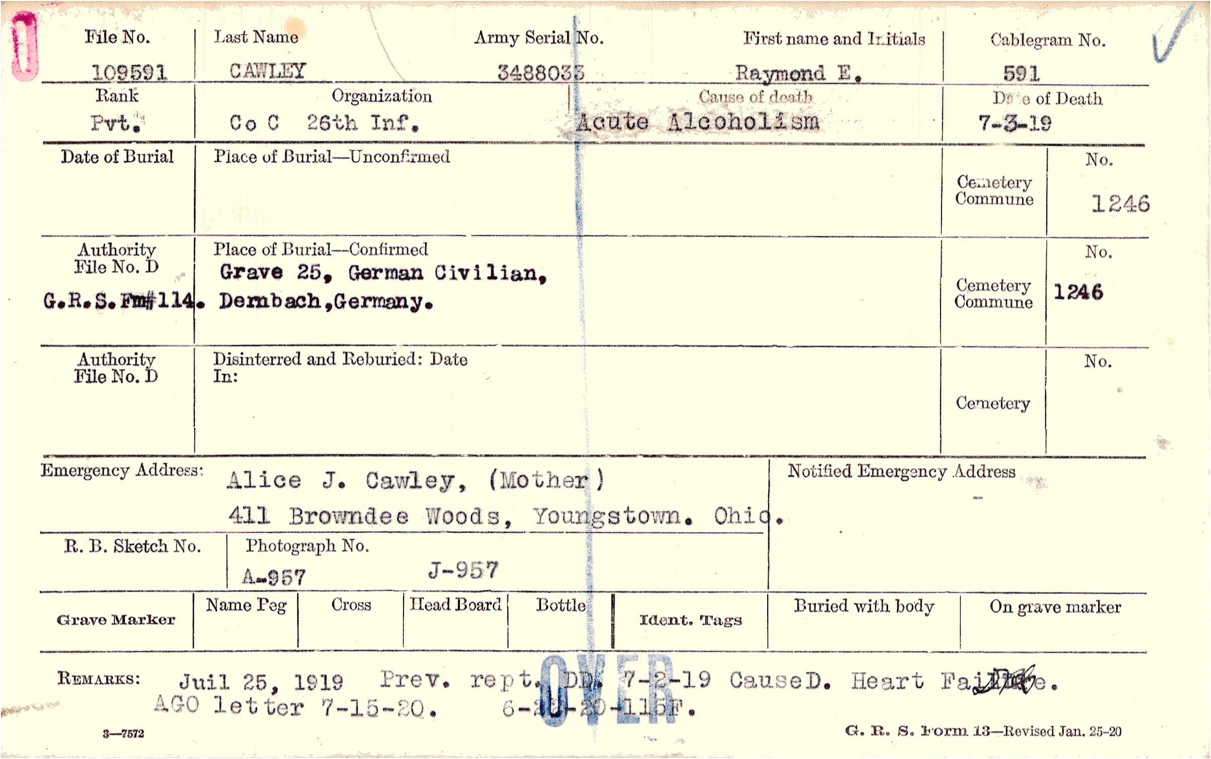 Alice J. Cawley, (Mother), 411 Browndee Woods, Youngstown. Ohio.