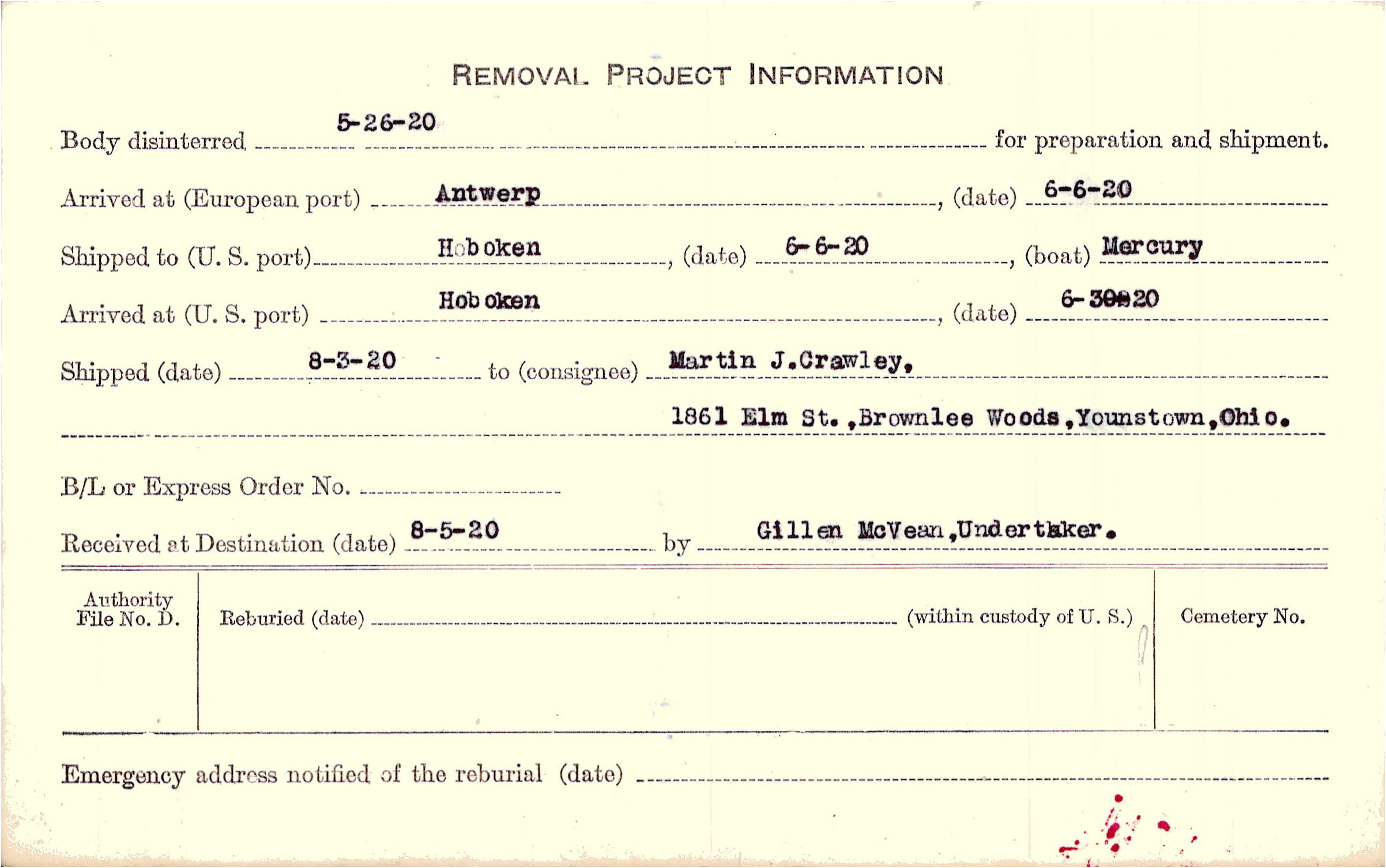 Body disinterred 5/26/1920 for preparation and shipment.