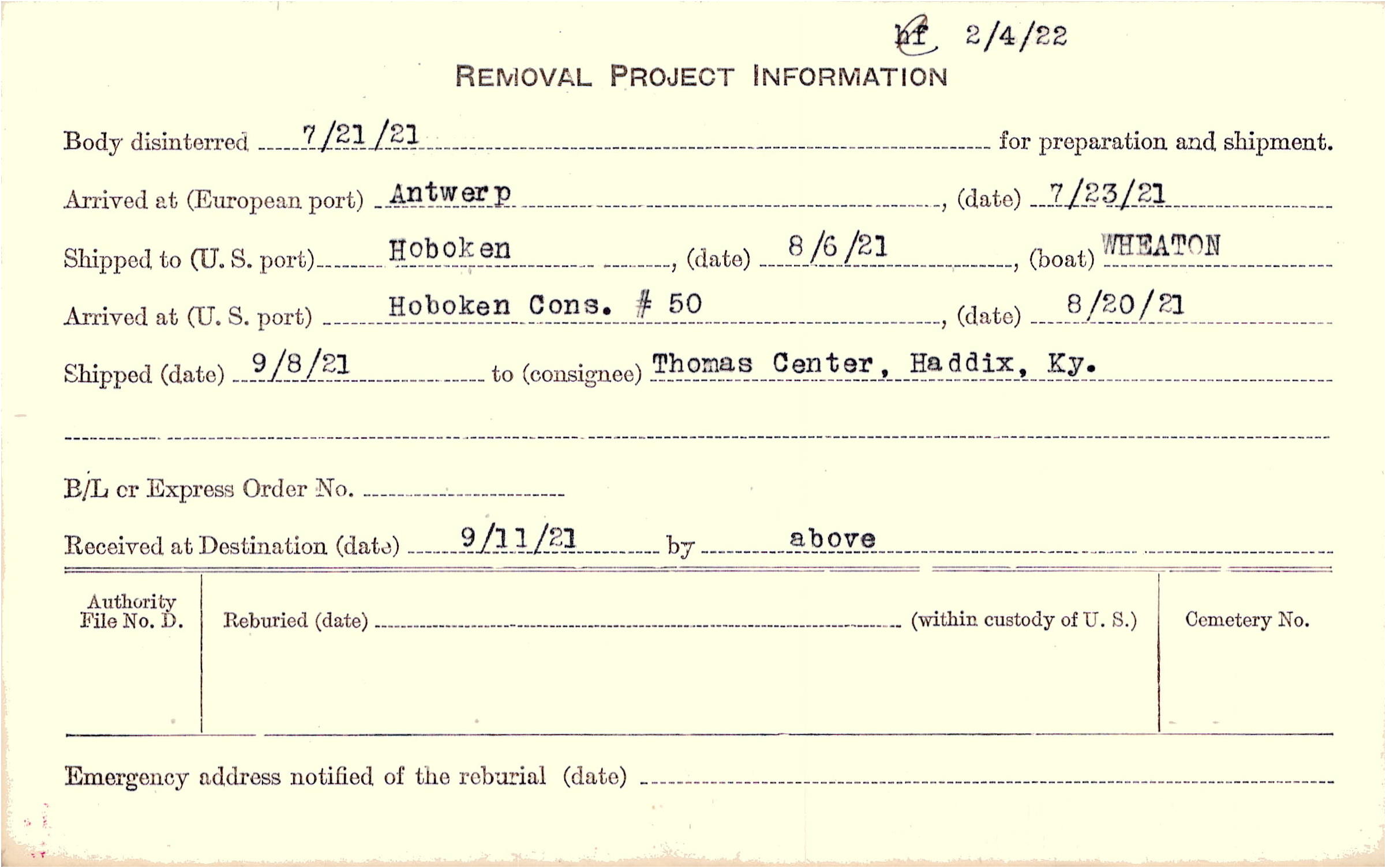 Body disinterred 7/21/1921 for preparation and shipment.
