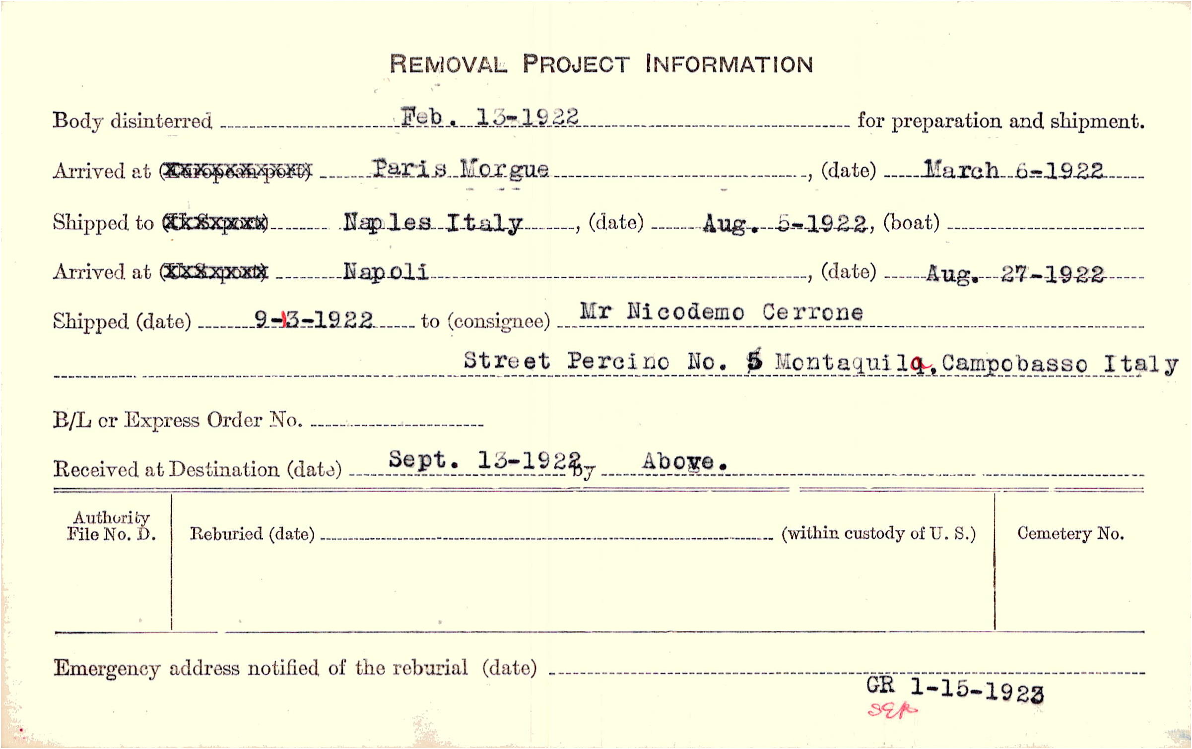 Body disinterred 2/13/1922 for preparation and shipment.