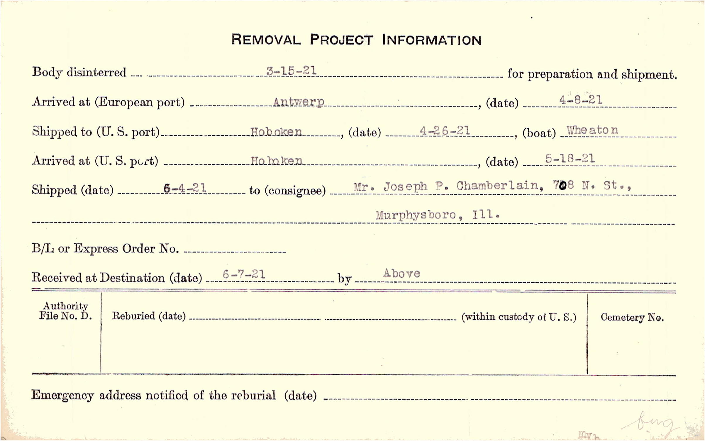 Body disinterred 3/15/1921 for preparation and shipment.