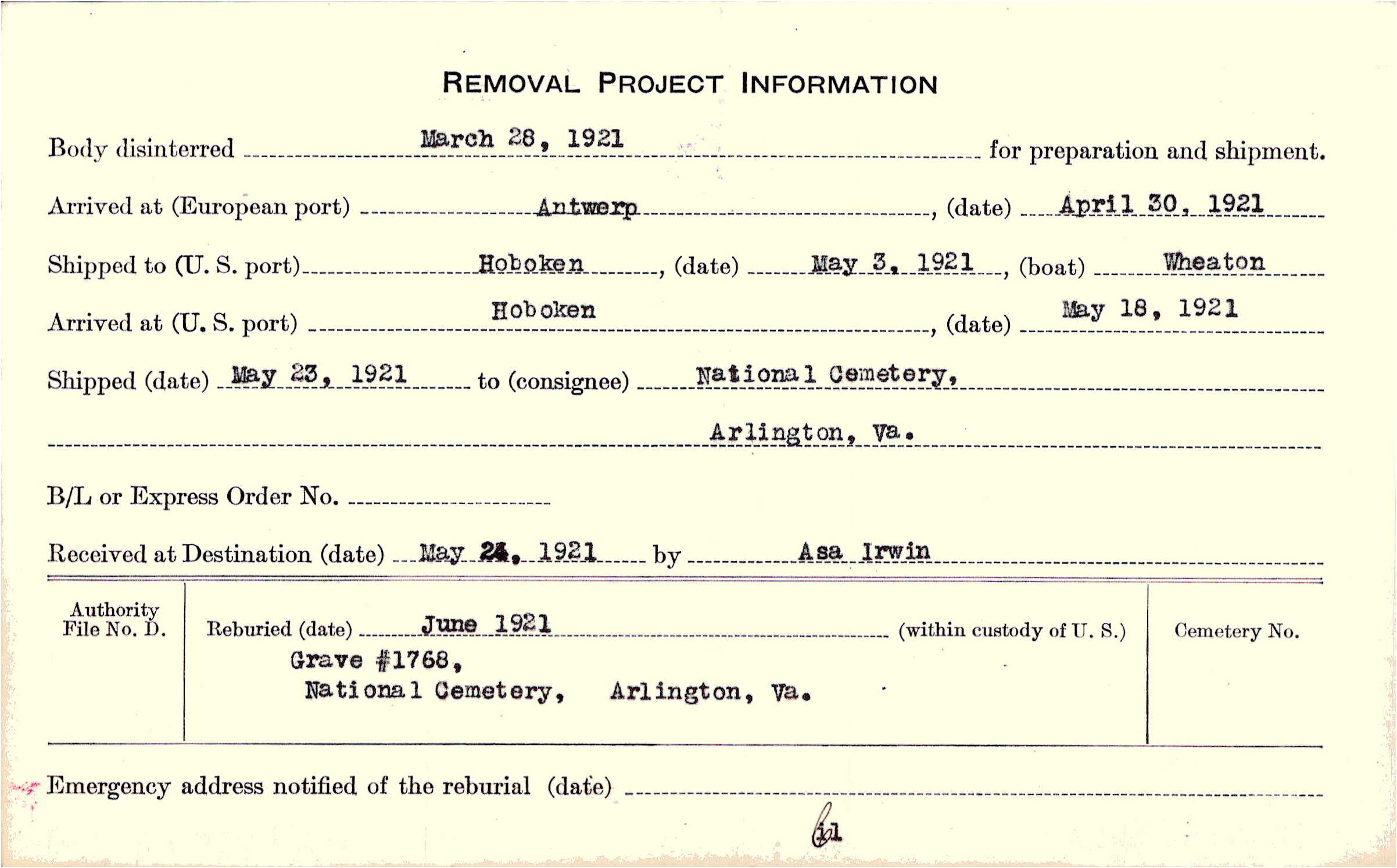 Body disinterred 3/28/1921 for preparation and shipment.