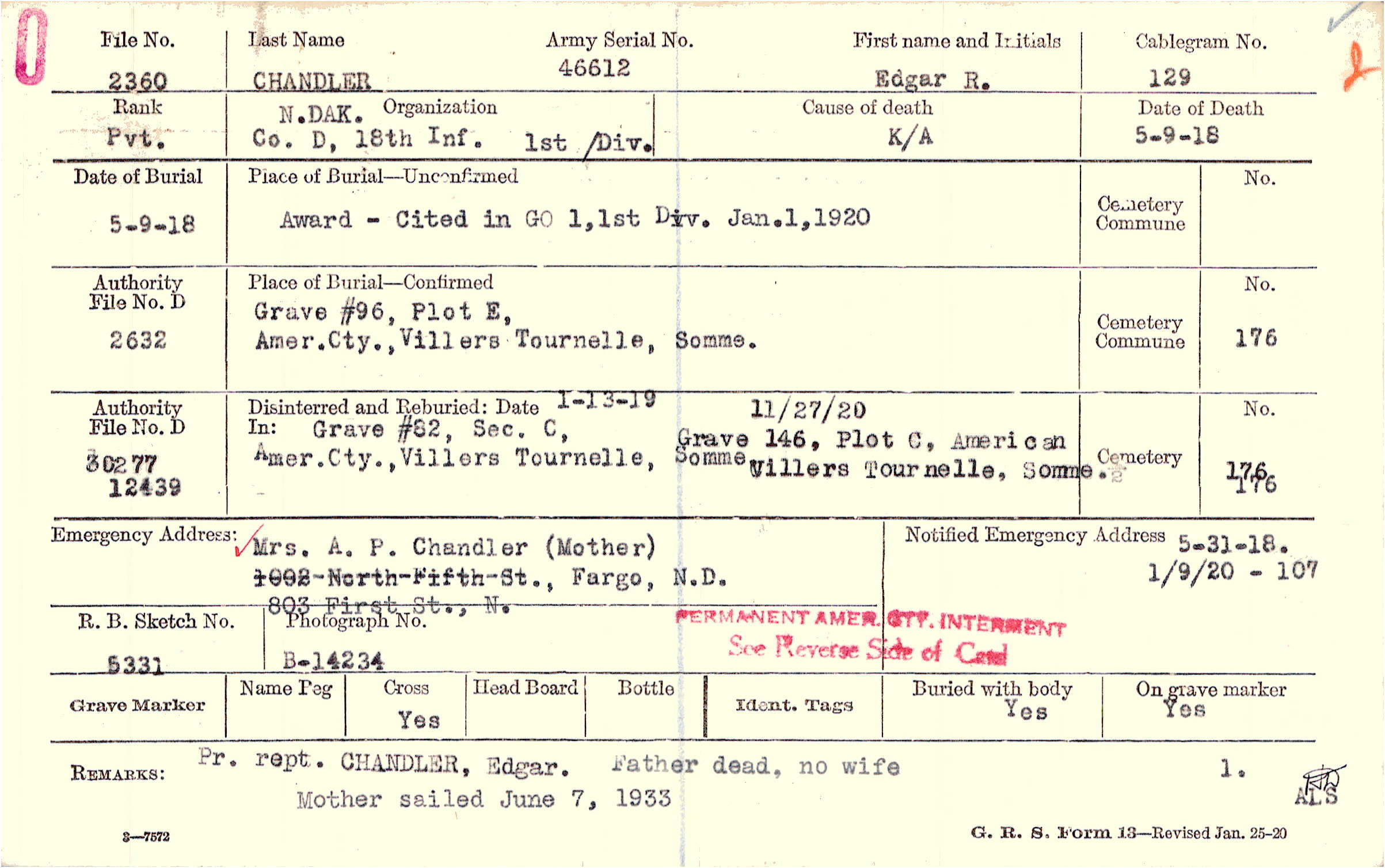 Mrs. A. P. Chandler (Mother), 803 First St., N., Fargo, N.D., Fargo, N.D.