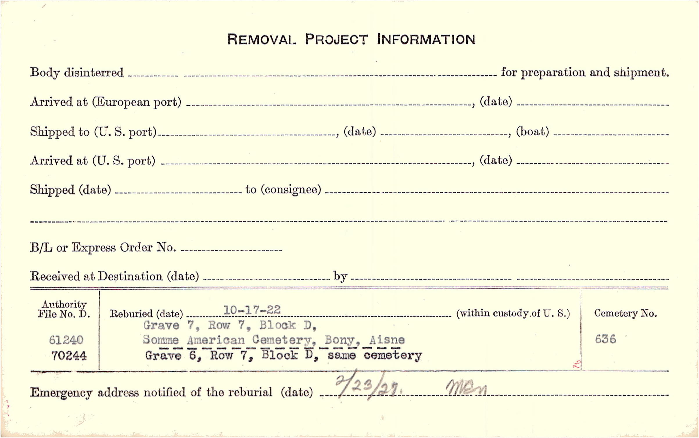 Prior Burial in Foreign Cemetery |