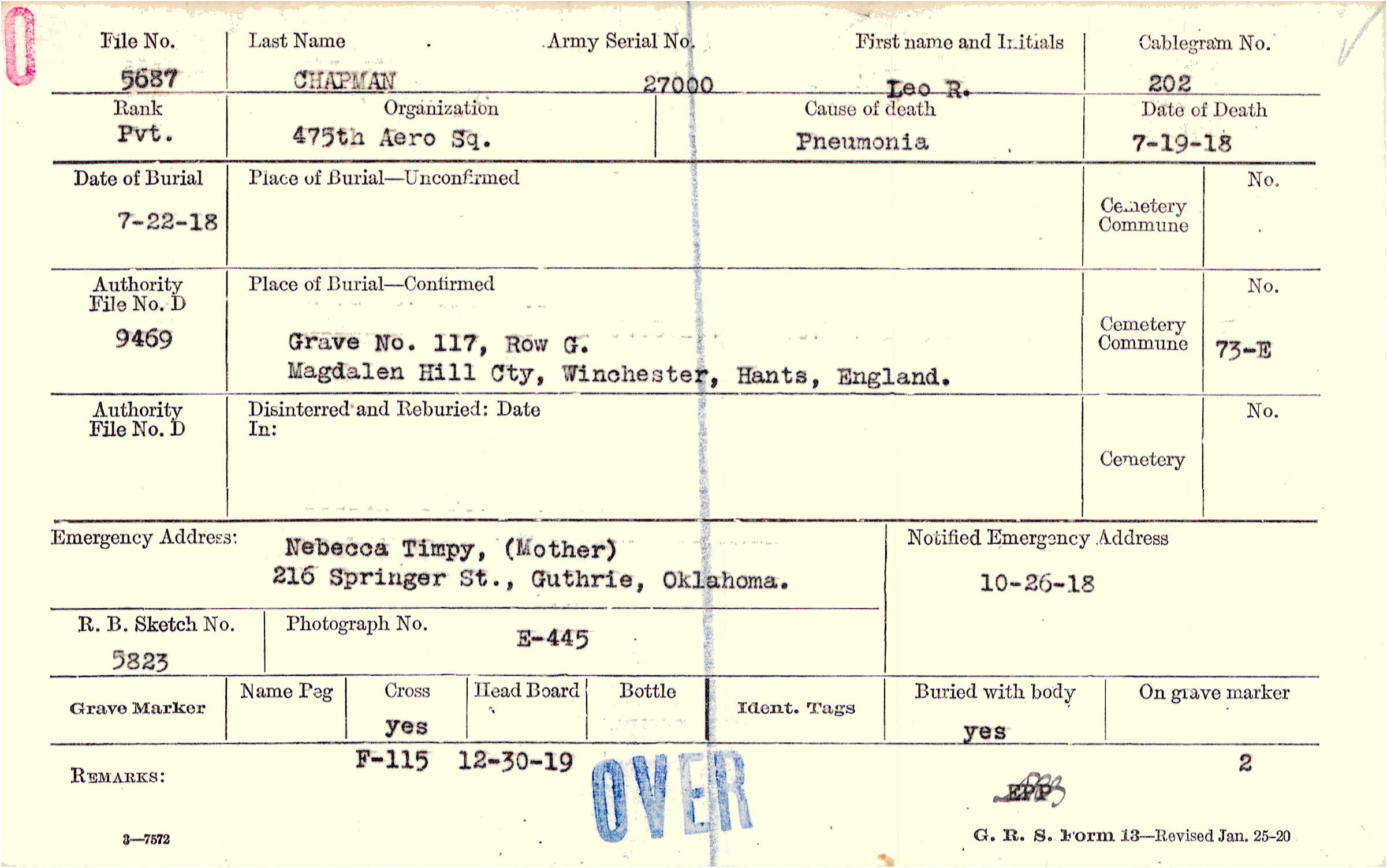 Nebecca Timpy, (Mother), 216 SPringer St., Guthrie, Oklahoma.