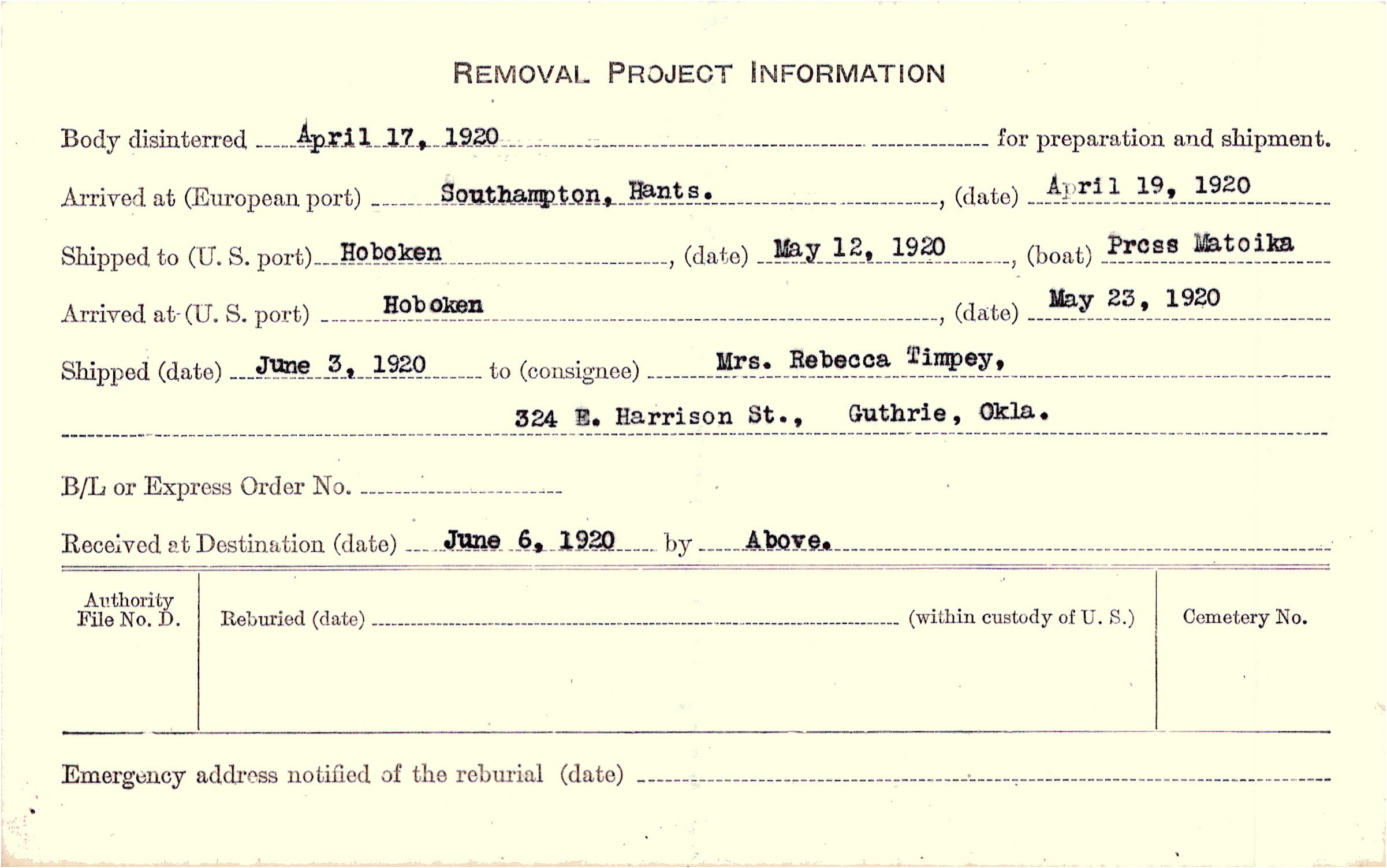 Body disinterred 4/17/1920 for preparation and shipment.