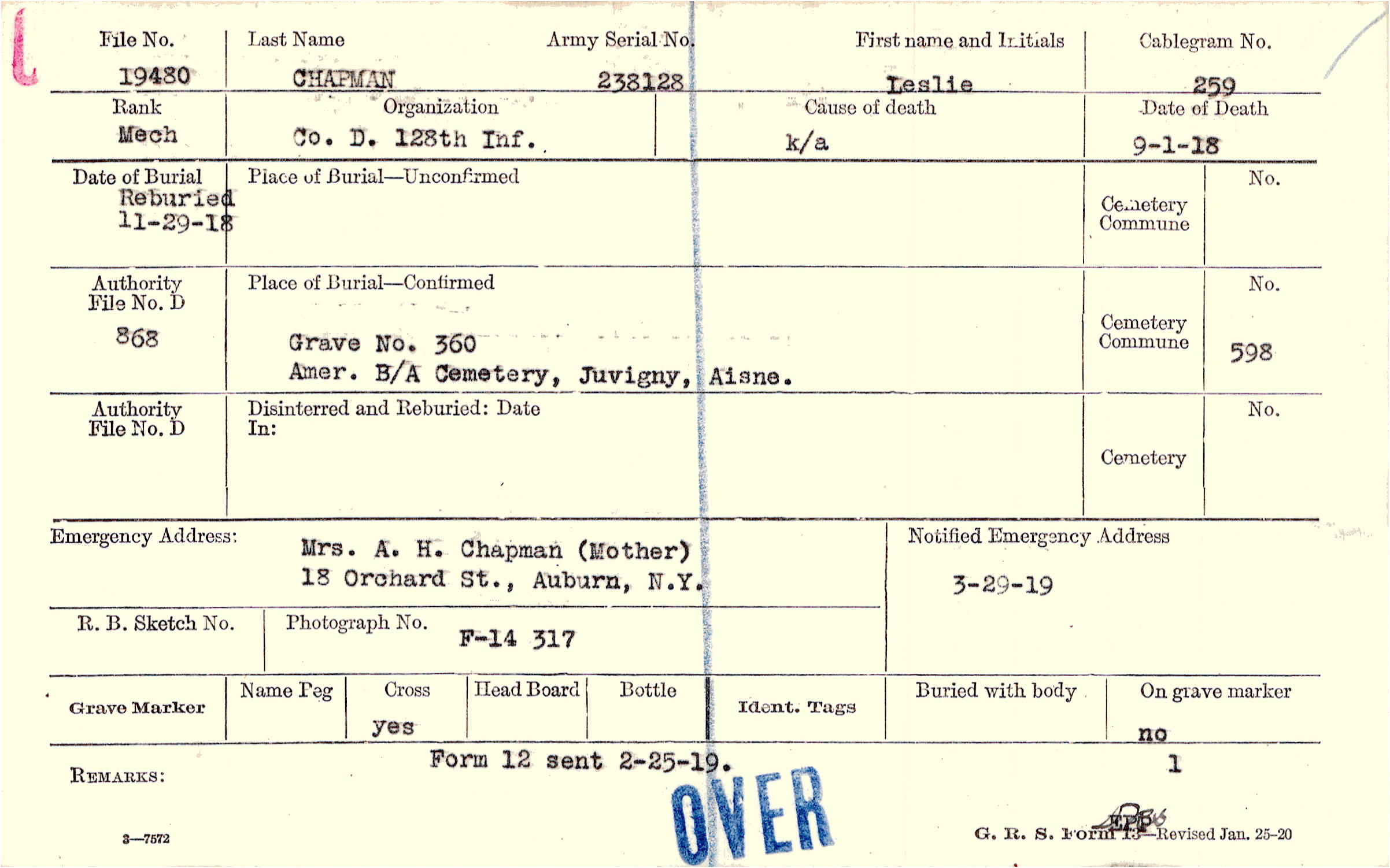 Mrs. A. H. Chapman (Mother), 18 Orchard St., Auburn, N.Y.
