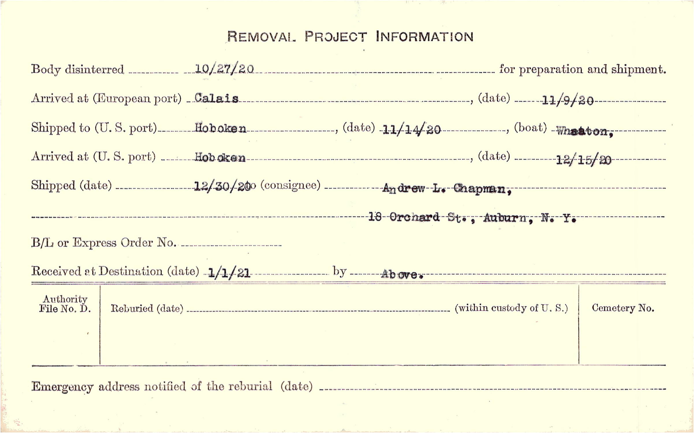 Body disinterred 10/27/1920 for preparation and shipment.