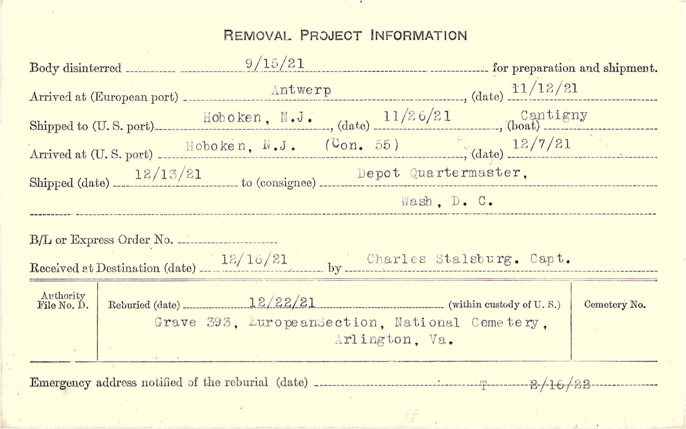 Body disinterred 9/15/1921 for preparation and shipment.