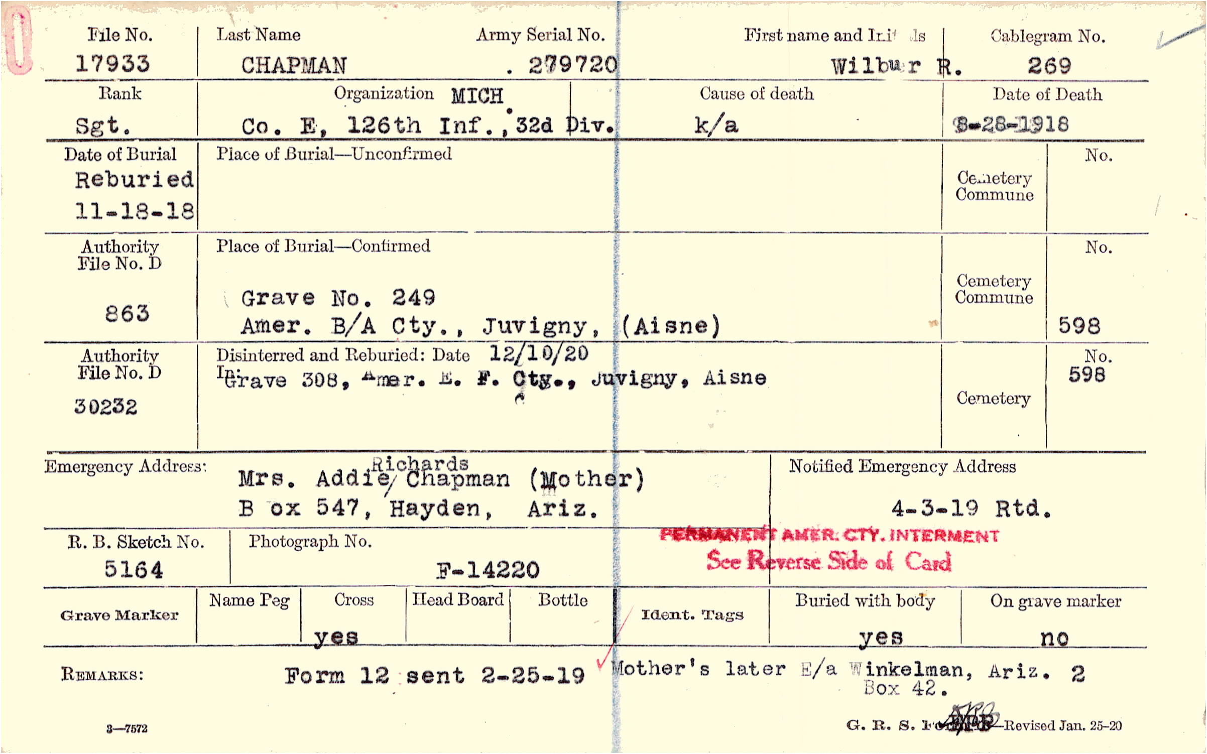 Mrs. Addie/Richards Chapman (Mother), Box 547, Hayden, Ariz., Richards