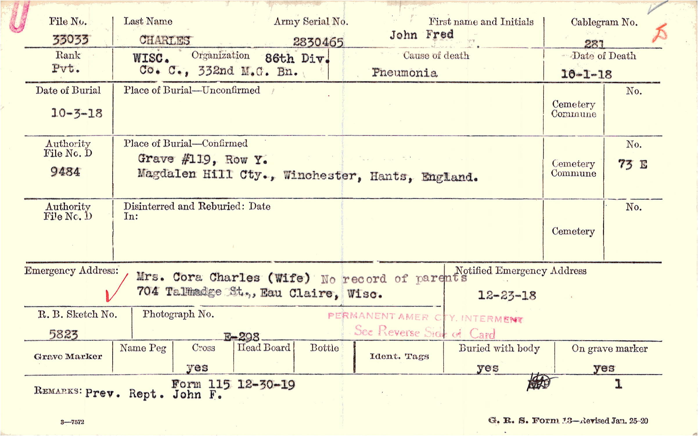 Mrs. Cora Charles (Wife), 704 Talmadge St., Eau Claire, Wisc., No record of parents