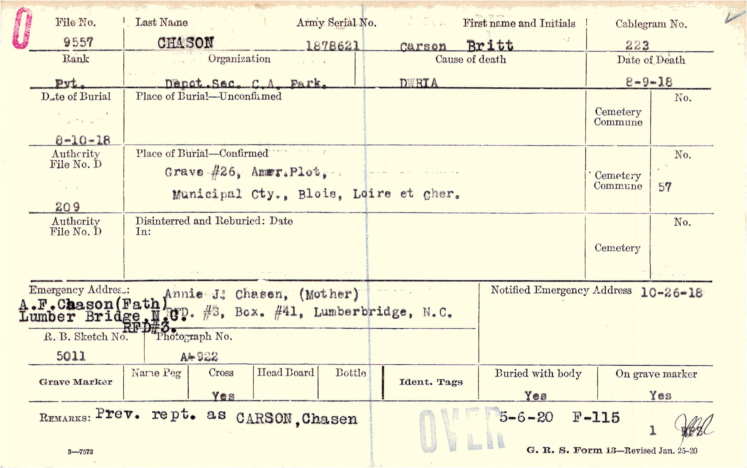 Annie J Chasen, (Mother), RFD. #3, Box. #41, Lumberbridge, N.C. Lumber Bridge, N.C. RFD #3., A.F. Chason (Father), RFD#3, Lumber Bridge, North Carolina