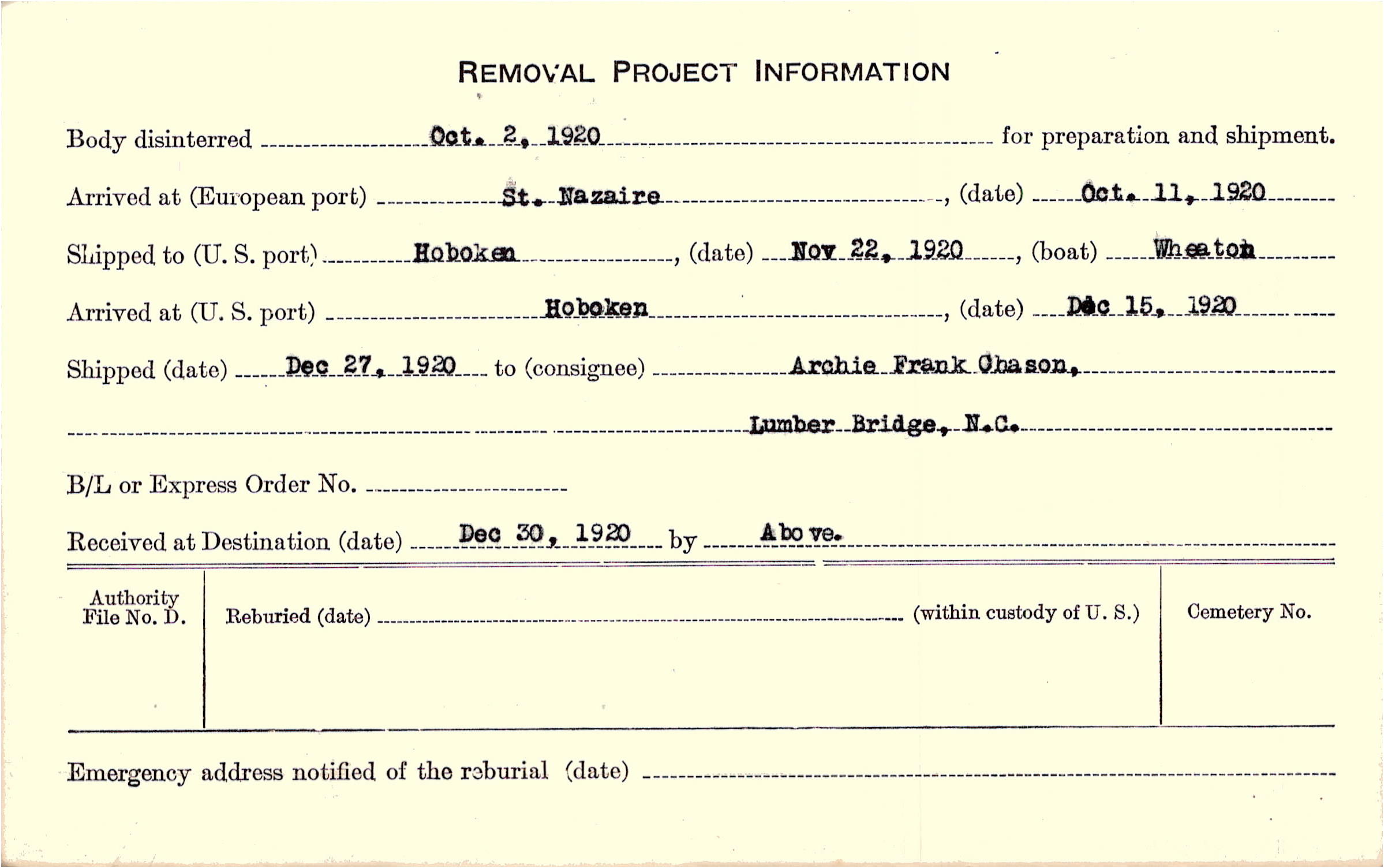 Body disinterred 10/2/1920 for preparation and shipment.