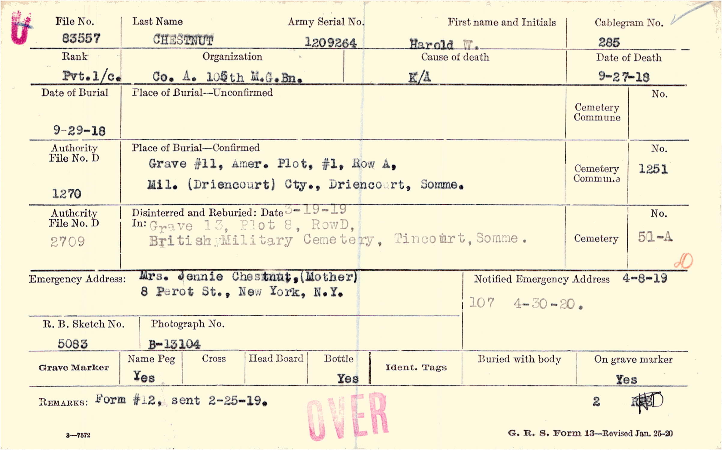 Mrs. Jennie Chestnut,(Mother), 8 Perot St., New York, N.Y.